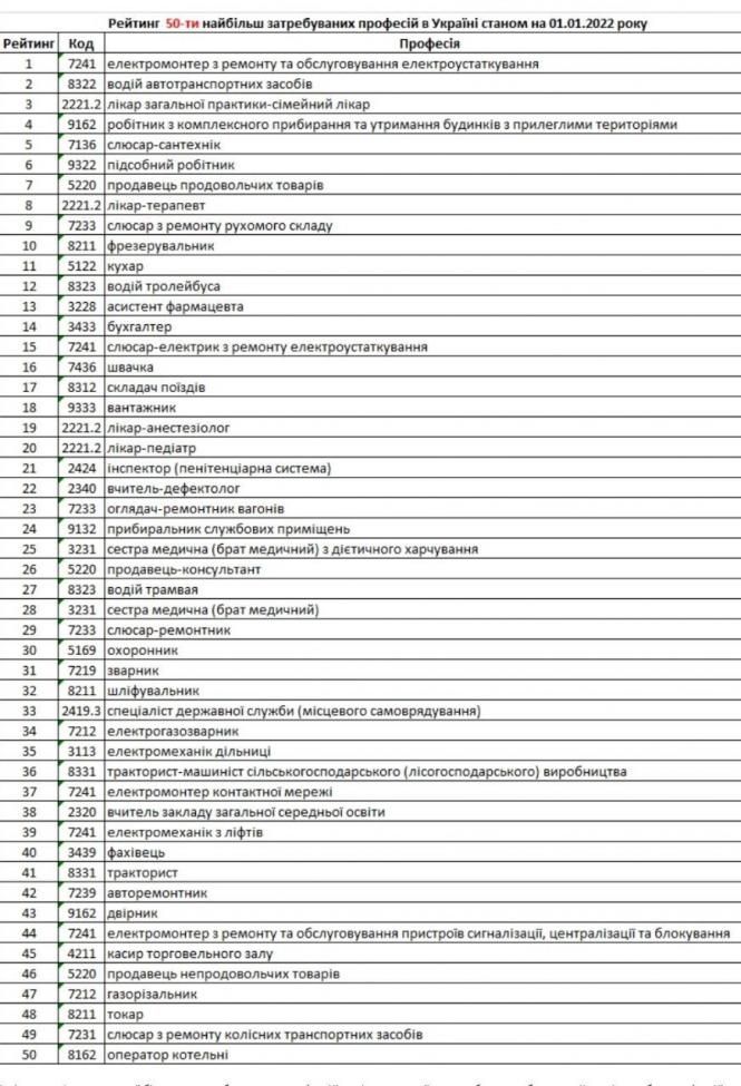 Портал «Кваліфікаційна мапа України» вивчає ринок праці. На основі останніх даних, актуальних на січень 2022 року, вони склали ТОП-50 професій, які найбільше нині потрібні.