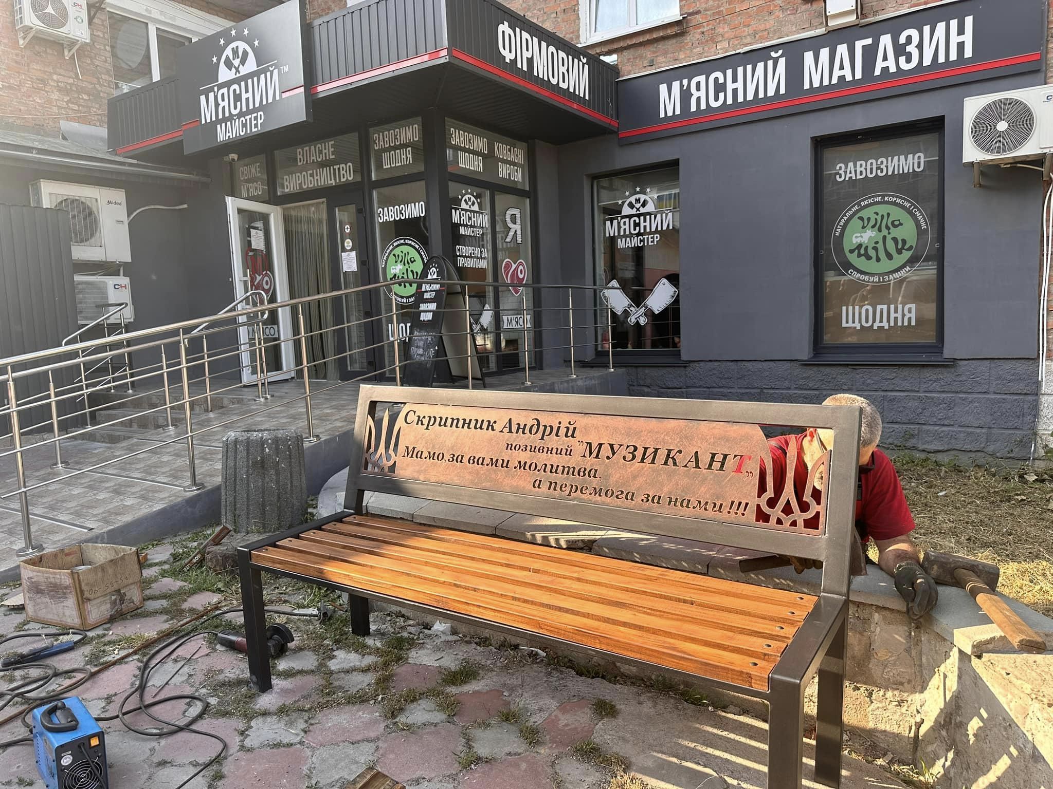На таких лавках вгорі зазначено прізвище її сина Андрій Скрипник, далі його фронтовий позивний — «Музикант». Трохи нижче слова: «мамо, за вами молитва, а перемога за нами».