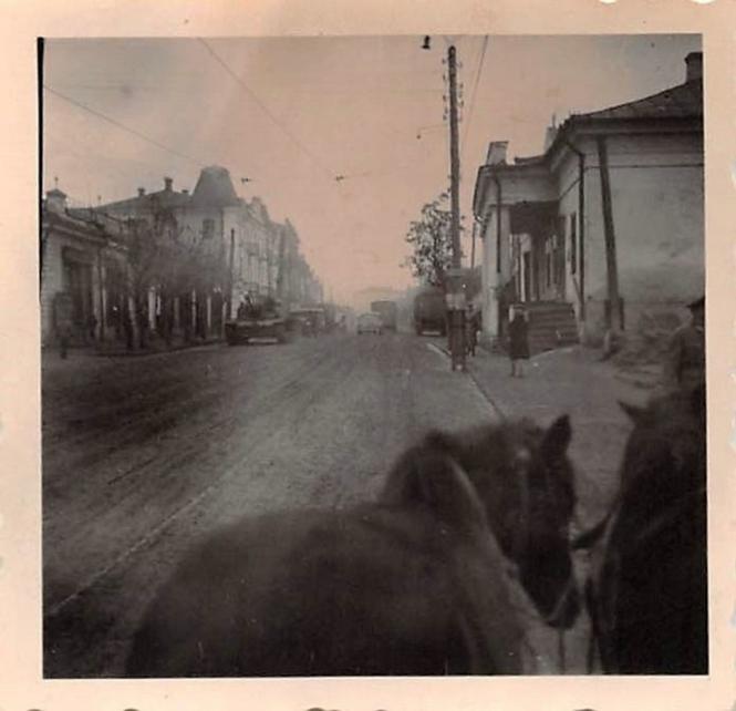 Ця ж будівля з колонами у часи німецької окупації. Справа за кадром — те місце, де зараз суд.