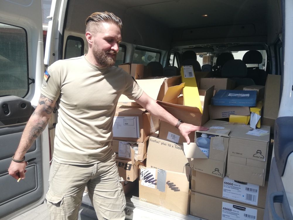 …Ми підійшли з ним до автомобіля подивитися на вантаж. Бус заповнений коробками з ліками. Всі препарати німецьких виробників. На дверцях кольори нашого прапора. До речі, на рукаві футболки волонтер також синьо-жовта смужка. На задній частині кузова — кольори прапора Німеччини.