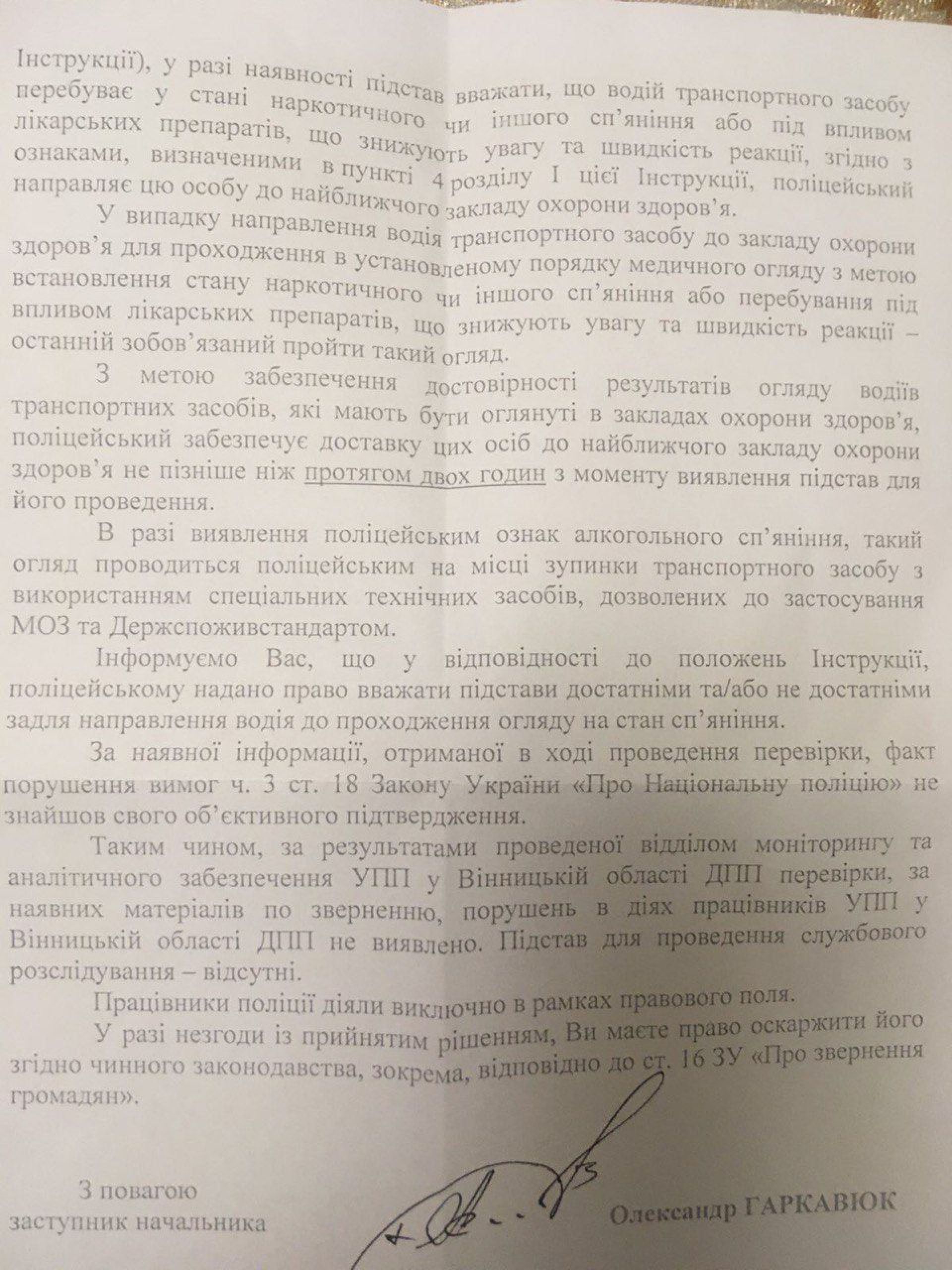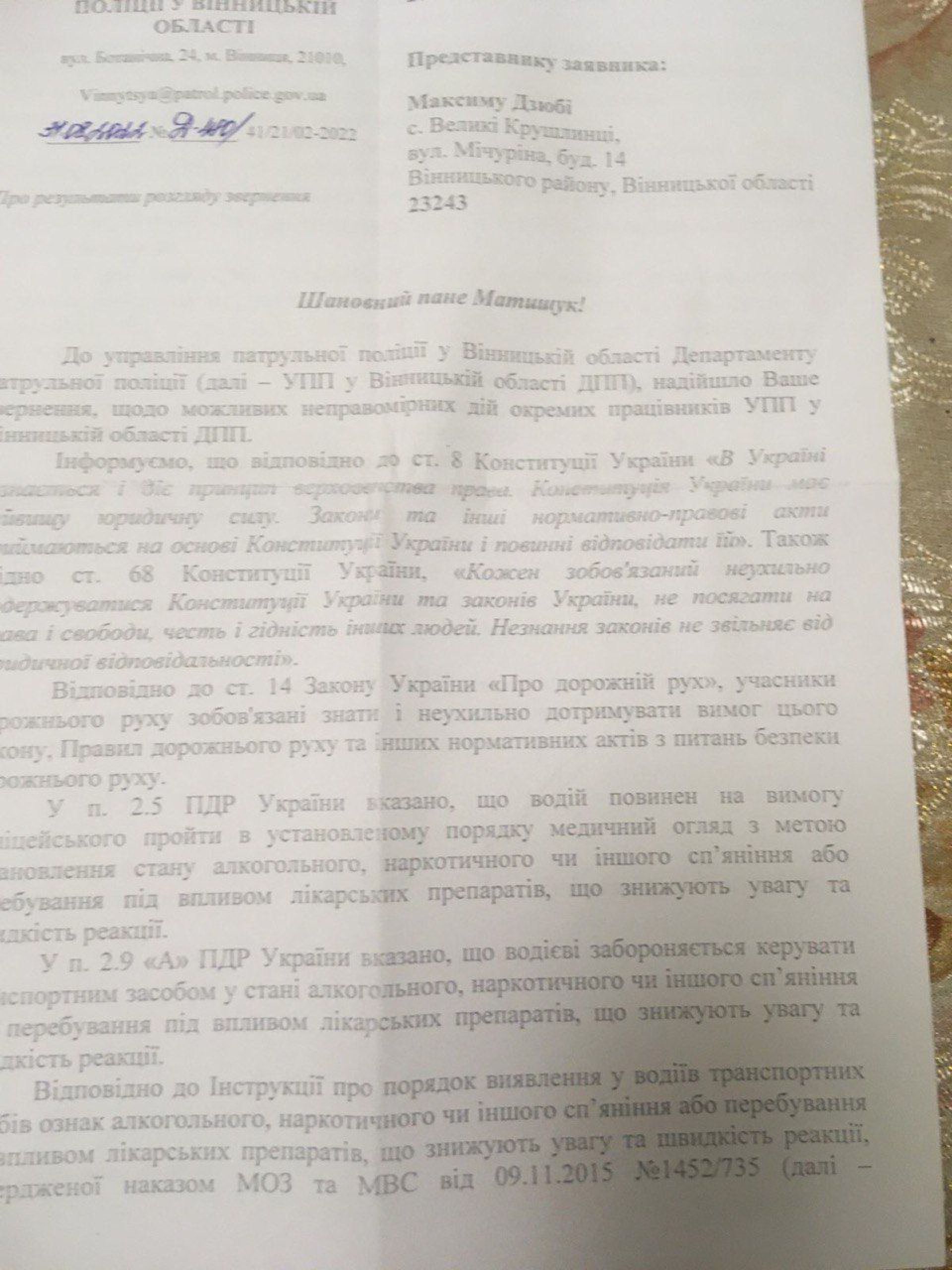 Через цей інцидент чоловік подав скаргу до Головного управління поліції у Вінницькій області. У відповіді сказали, що порушень з боку працівників поліції не виявили.