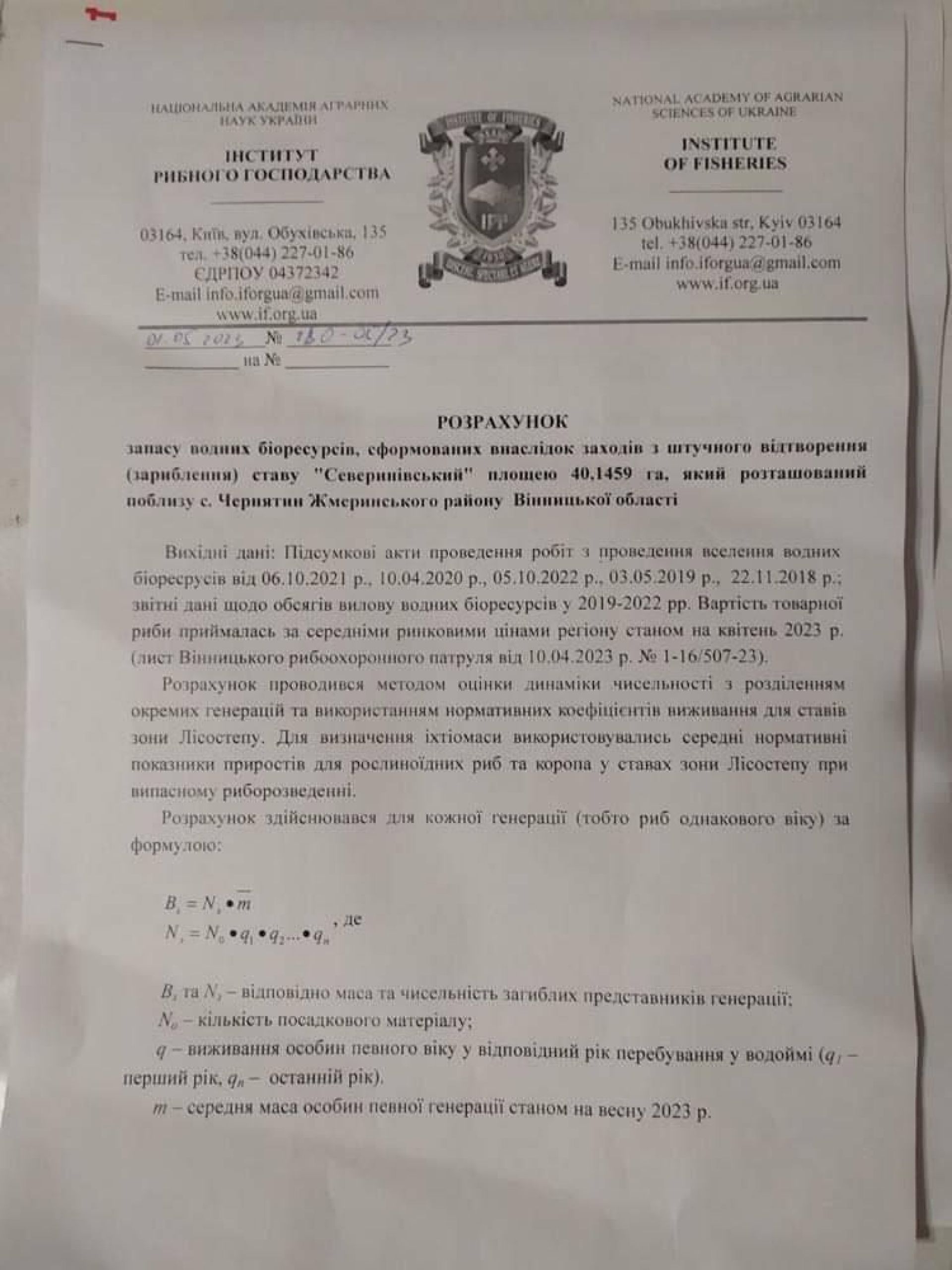 На їхнє замовлення Інститут рибного господарства НААН розробив режим рибогосподарської експлуатації водойми площею 40,1459 га на землях Северинівської сільської ради. Цей режим у 2017 році погодили Управління Державного агентства рибного господарства у Вінницькій області та Державне агентство рибного господарства України. Термін його дії був з 13 листопада 2017 року по 31 грудня 2026 року.