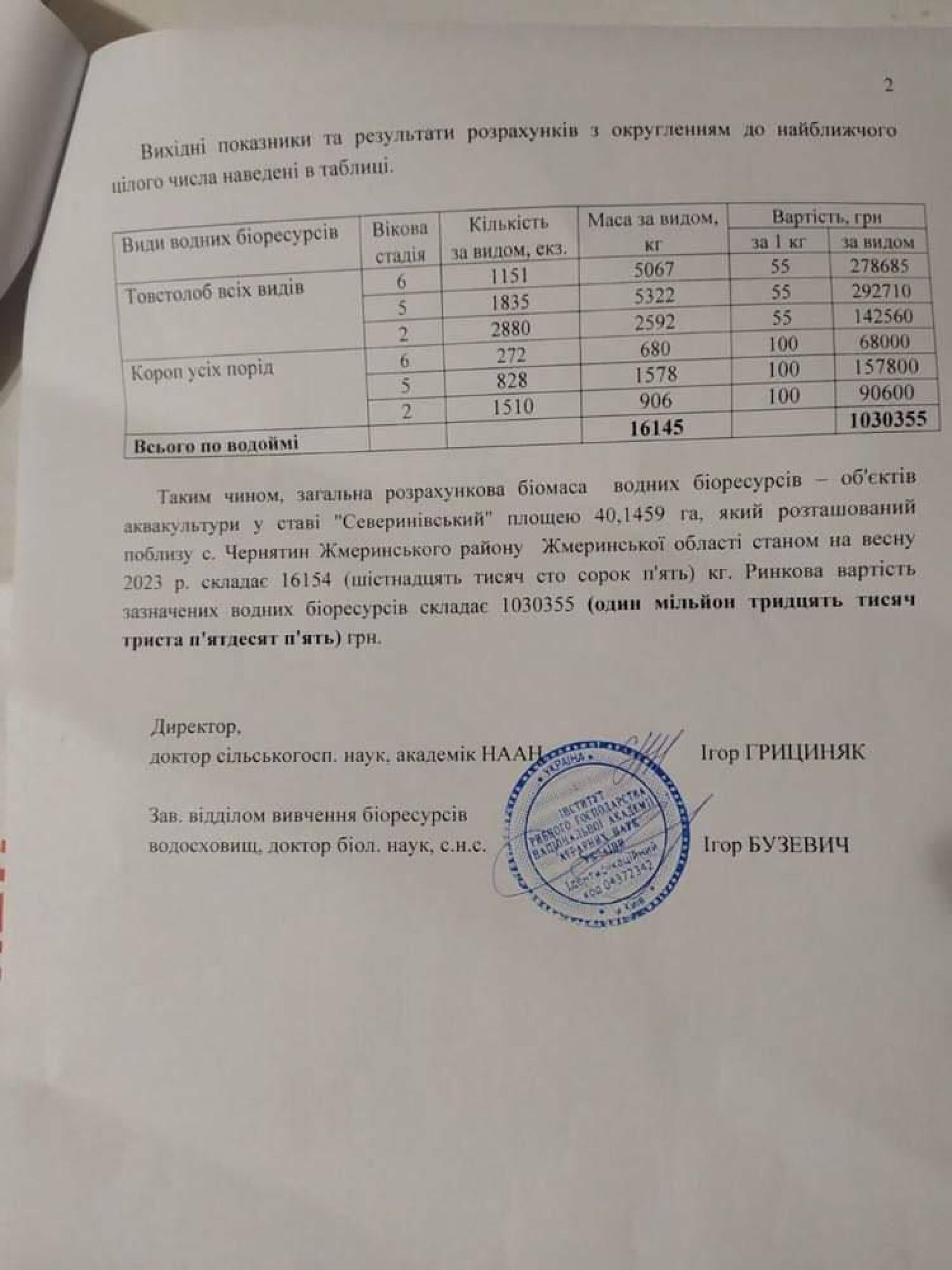 — Попри те, що акт передачі ми підписали лише в березні 2024 року, на водоймі працювали люди, — говорить Віктор. — Державний інститут рибного господарства порахував, скільки риби залишилося у водоймі. Там на мільйон і тридцять тисяч гривень.