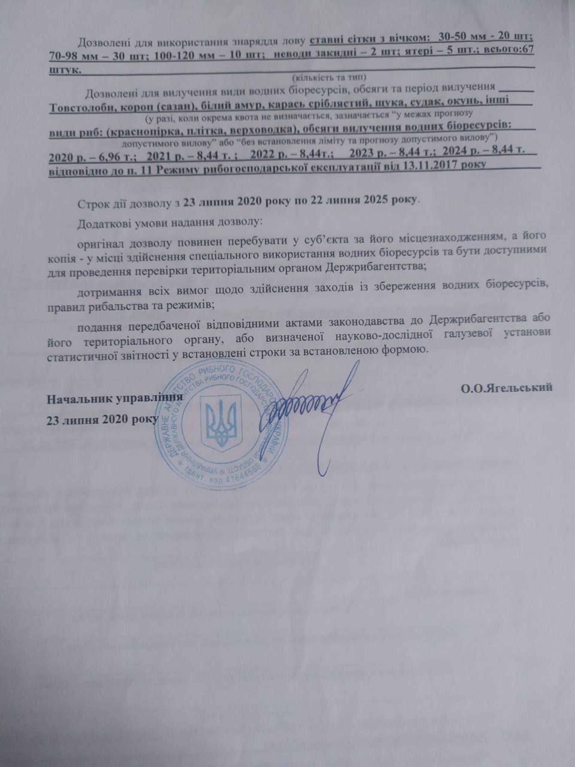 Крім того, у 2020 році компанія отримала від Управління Державного агентства рибного господарства у Вінницькій області дозвіл на спеціальне використання водних біоресурсів у рибогосподарських водних об'єктах (їх частинах) строком дії з 23 липня 2020 року по 22 липня 2025 року. Компанія щорічно здійснювала вселення та вилов водних біоресурсів в обсягах, встановлених режимом.