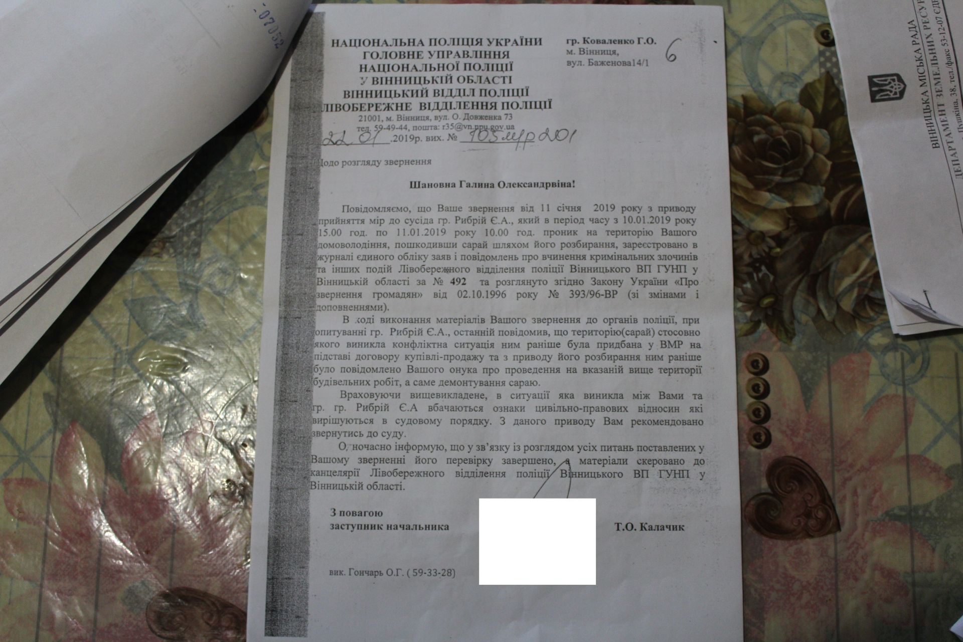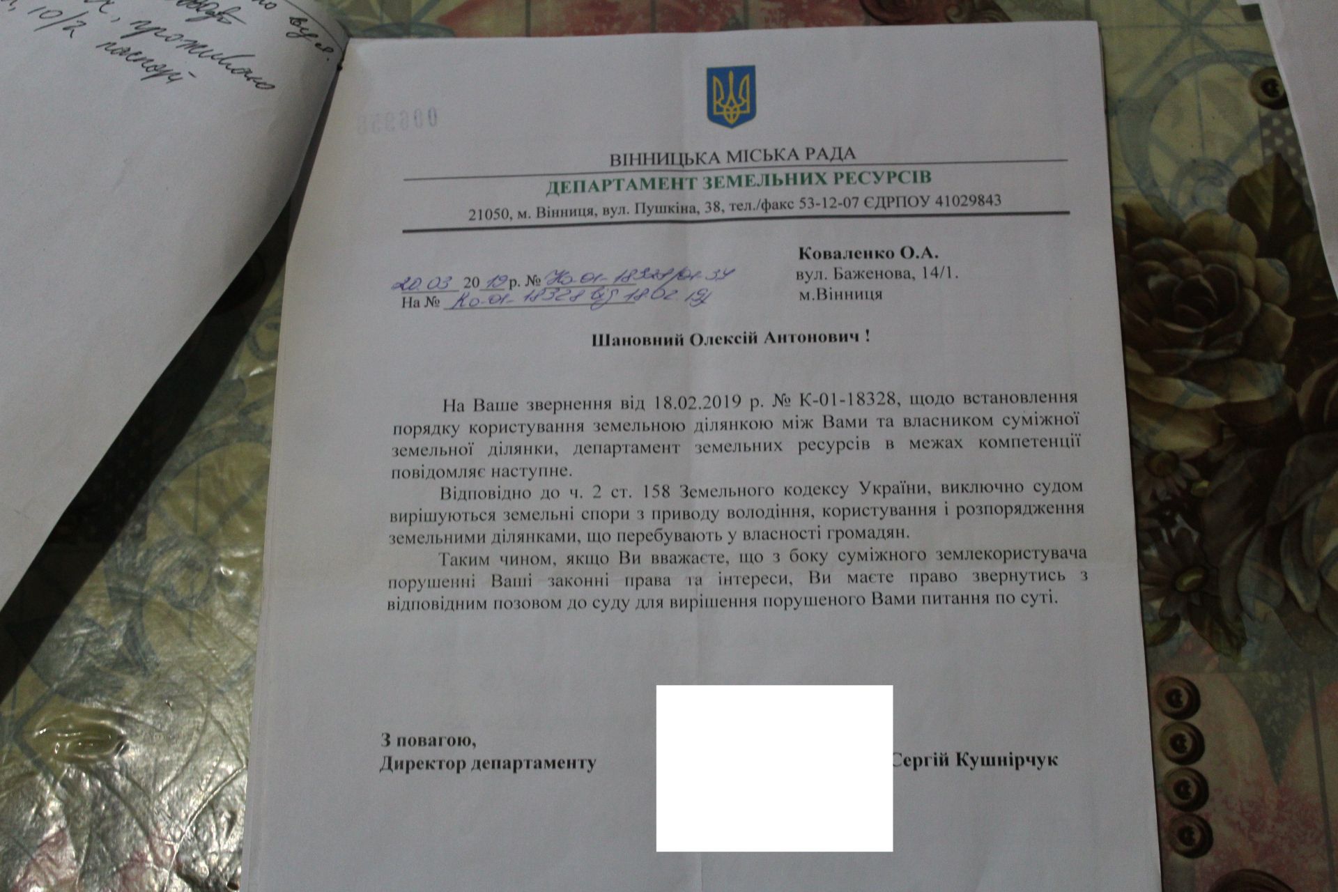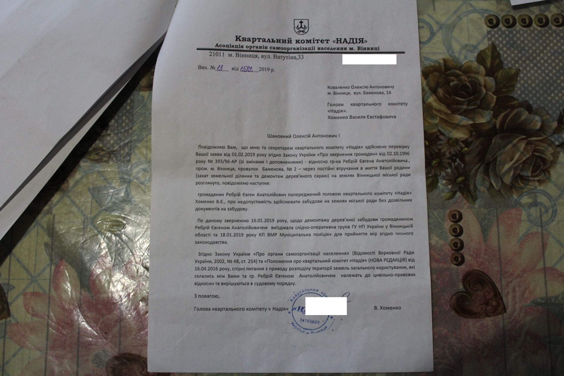 Вони зверталися до мерії, щоб та знайшла «управу» на сусідів. Назбирали товсті теки з листуванням, в яких тільки відписки. Як кажуть пенсіонери, після того як сусіди зруйнували їм ще сараїв (їх декілька у користуванні в Коваленко та Остапенко) стали займатись їх відновленням.