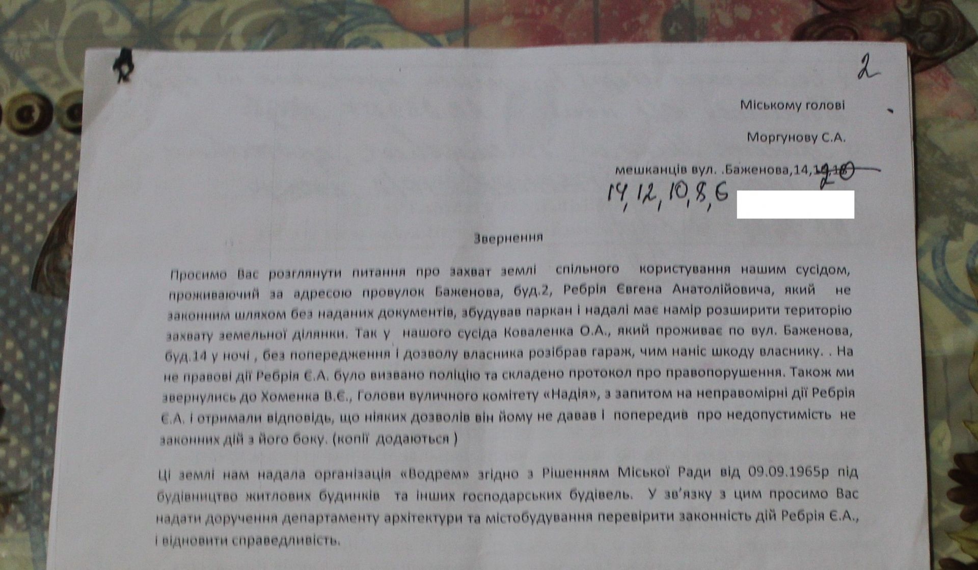 — На те, що сусіди встановили незаконний паркан, звернулася зі скаргою до департаменту архітектурно-будівельного контролю. І знаєте, що мені відповіли? Інспектор не може перевірити їх паркан і документи на землю, бо не може застати їх вдома! Хоменки та Ребрії уникають відповідальності, бо їх покриває голова квартального комітету, рідний брат Бориса Хоменка, — каже Марія Остапенко.