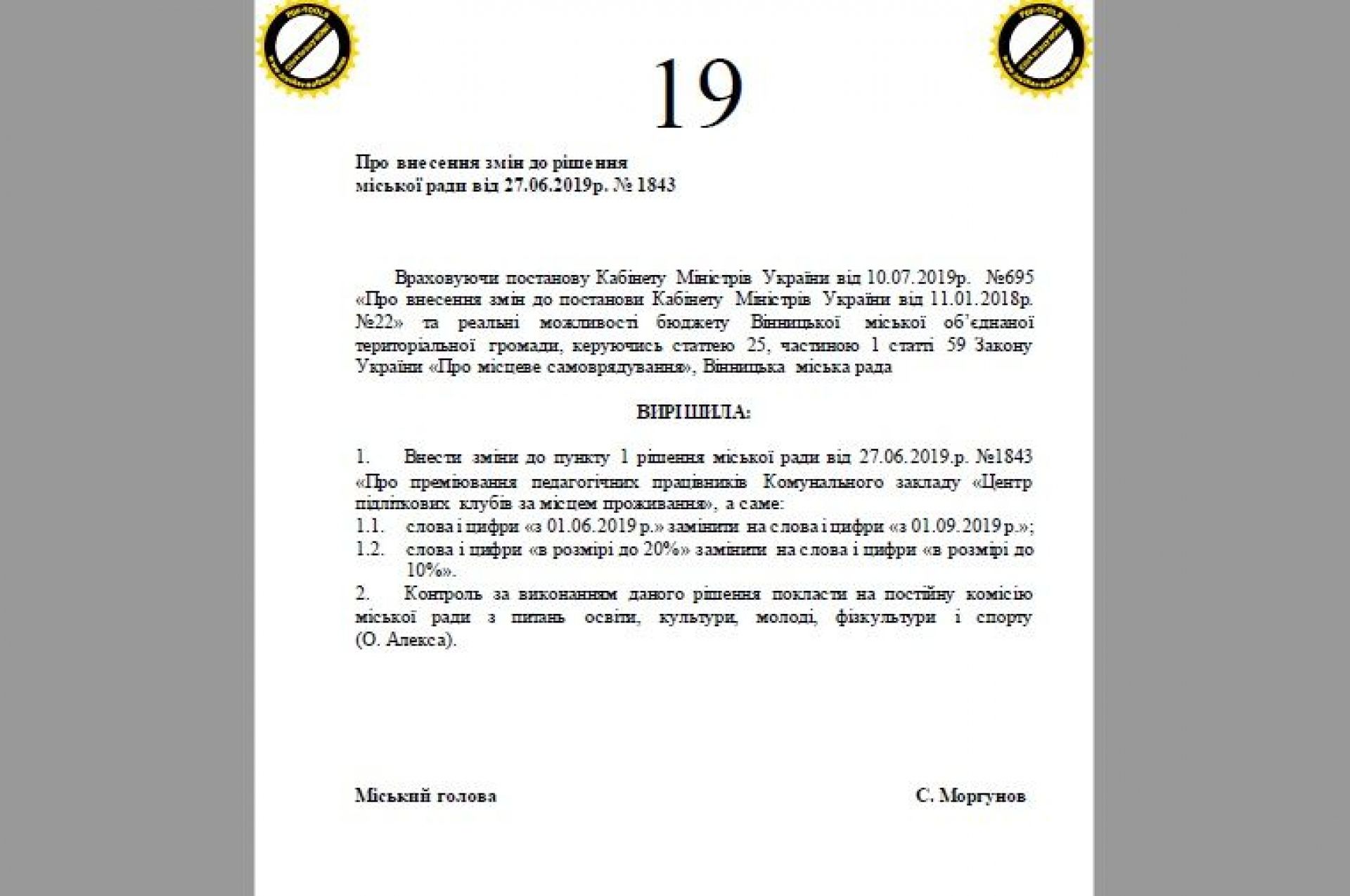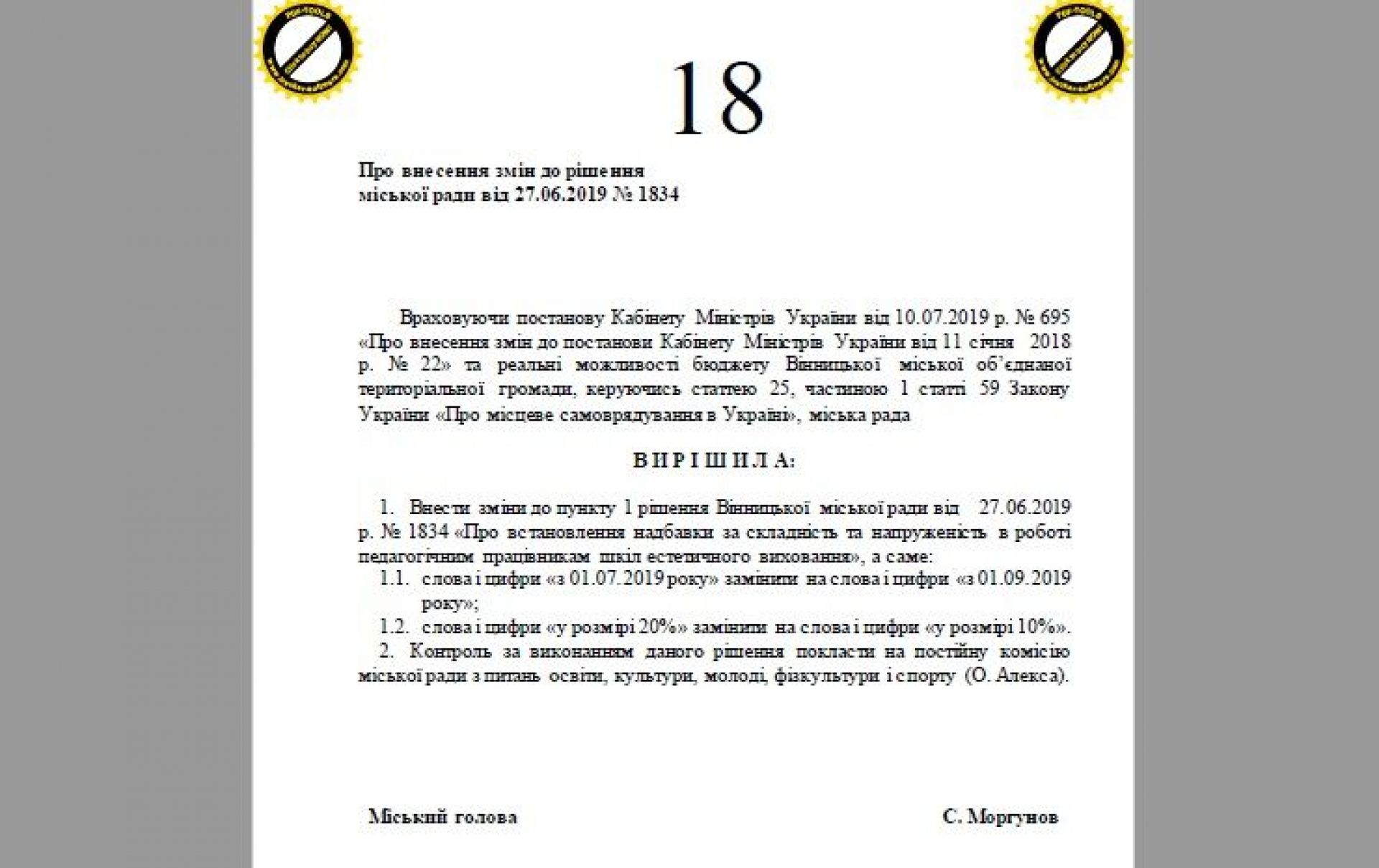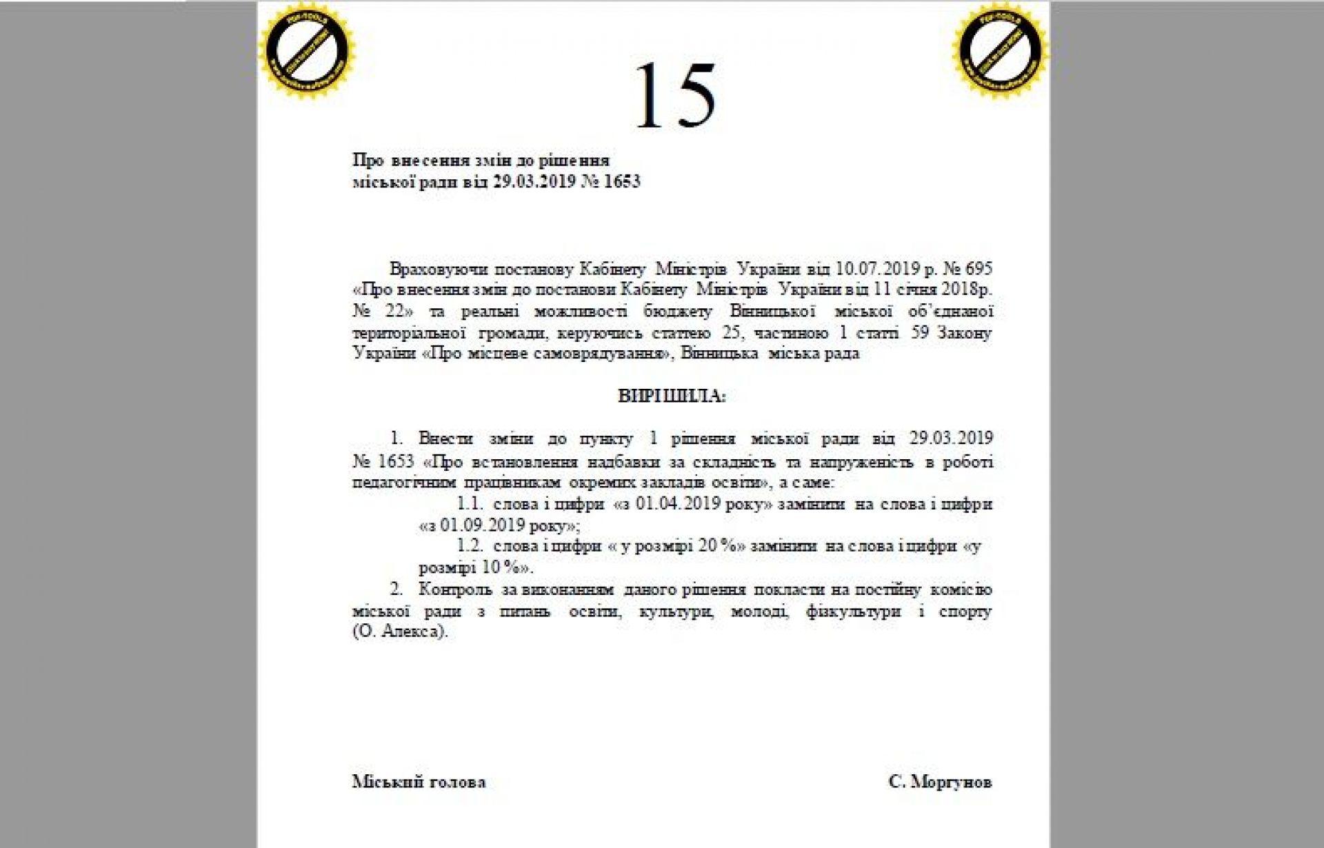 До сесії міської ради, яка відбудеться 4 жовтня, підготували проекти рішень, в яких йдеться про зменшення муніципальні надбавки педагогам з 20% до 10% від посадового окладу. Так, можуть зменшити надбавку: