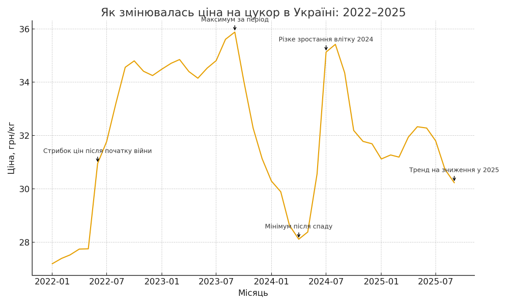 Але уже влітку відбувся новий стрибок: у липні–серпні ціна знову перевищила 35 грн/кг. Причинами стали сезонний дефіцит, коливання врожаю цукрових буряків та зростання витрат на переробку.