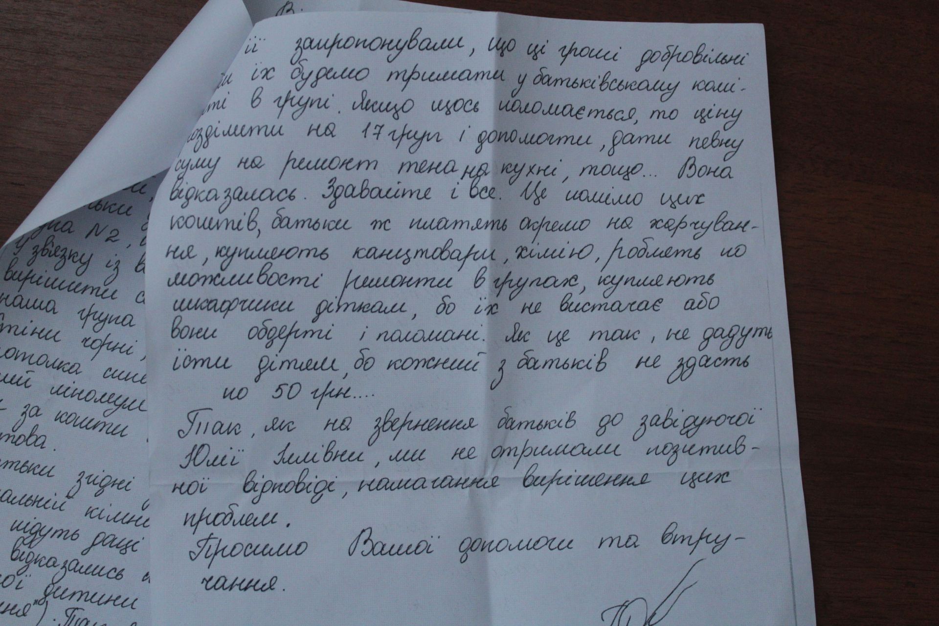 — Кожна людина здає 50 гривень щомісяця на потреби садочка. За ці півсотні ми оплачуємо канцтовари для адміністрації, зарплату програміста, ремонти кабінетів методиста, завідувача, ремонти кухні, — каже Олена. — Але детальної звітності по цих коштах немає. За внески пішла відкрита війна — якщо ми не будемо здавати, то завідувачка сказала, що наші діти, коли зламаються плити, їсти не будуть. А будуть чекати, поки держава відремонтує кухонне приладдя.