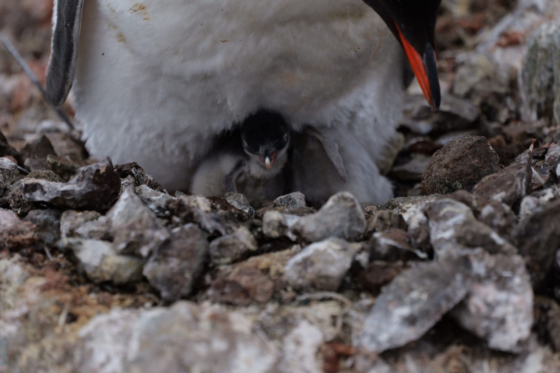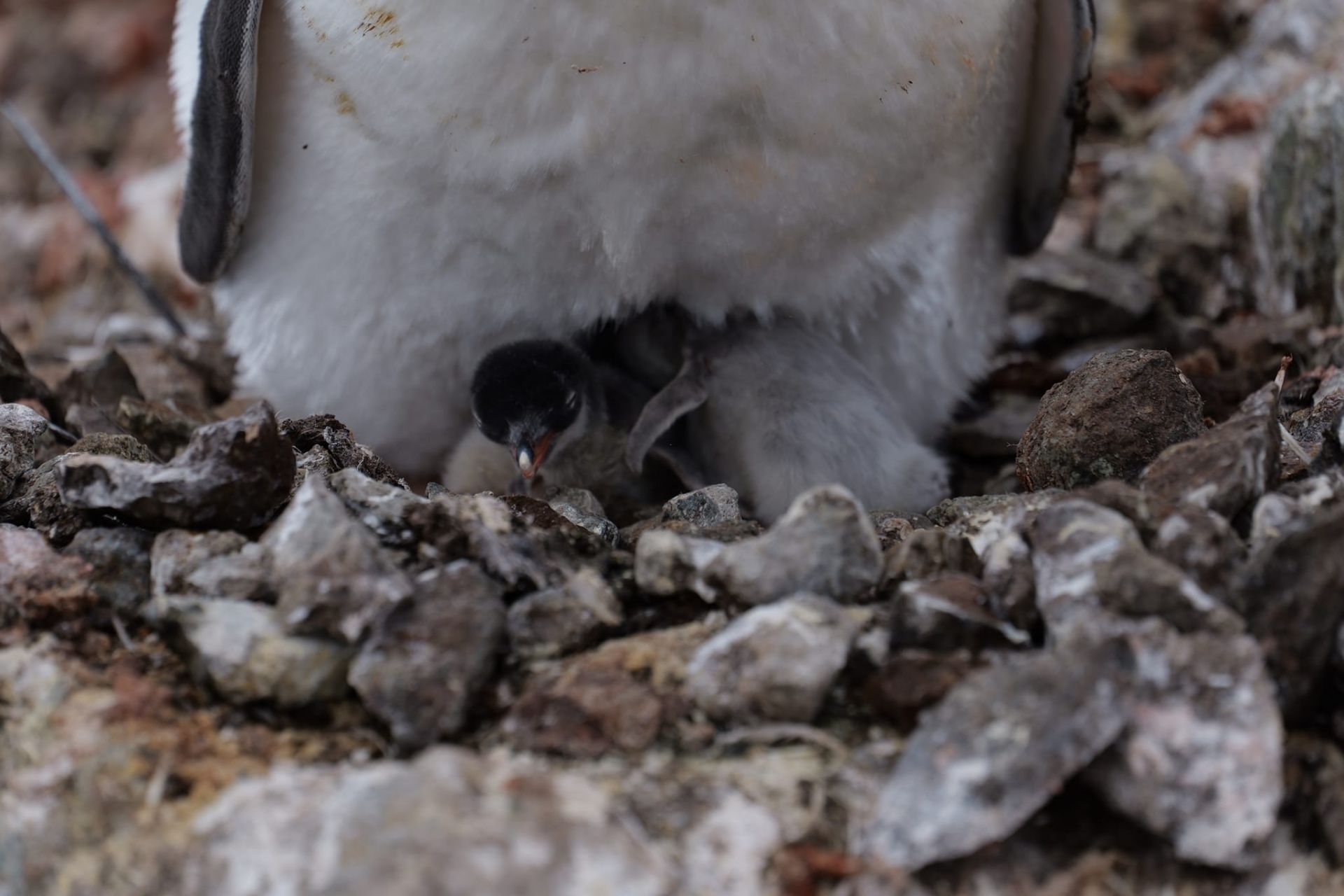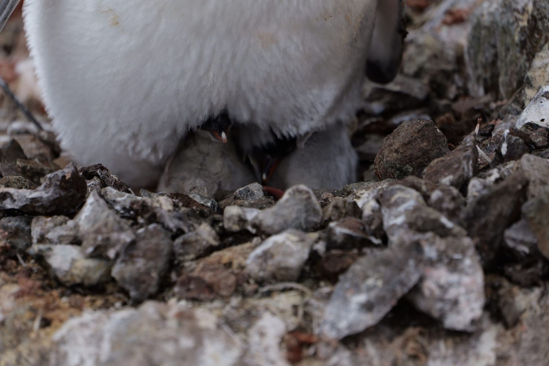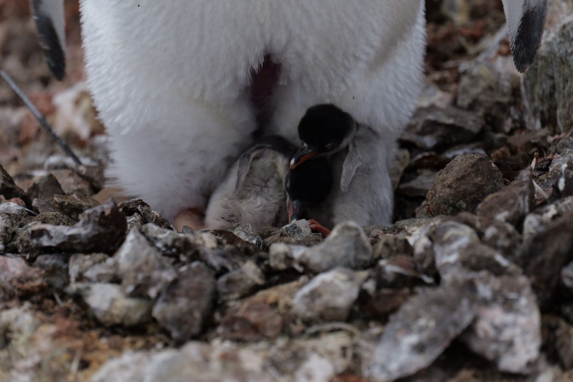 — Перше дитинча вже активне — годується, пищить, тож йому десь пів доби. А друге, мабуть, вилупилося прямо перед моїм приходом, бо воно ще в шматках шкаралупи й ховається під дорослого пінгвіна, — розповів вчений.