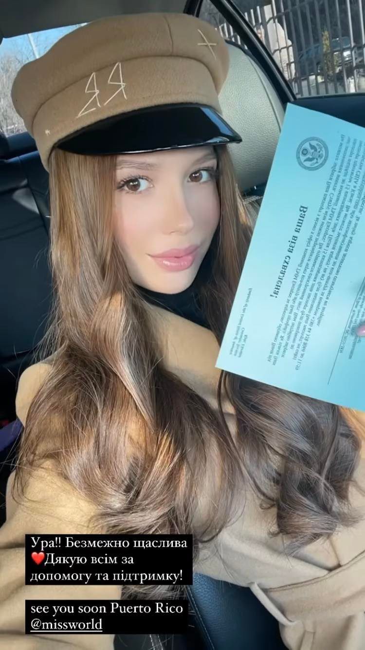 Завітний документ дівчина отримала 18 листопада, і вже в суботу 20 листопада відлітає у Пуерто-Ріко представляти нашу країну на міжнародному конкурсі «Міс Світу 2021», який відбудеться в середині грудня. Радісною новиною і щасливими світлинами з візою Олександра сьогодні поділилася в соцмережах.
