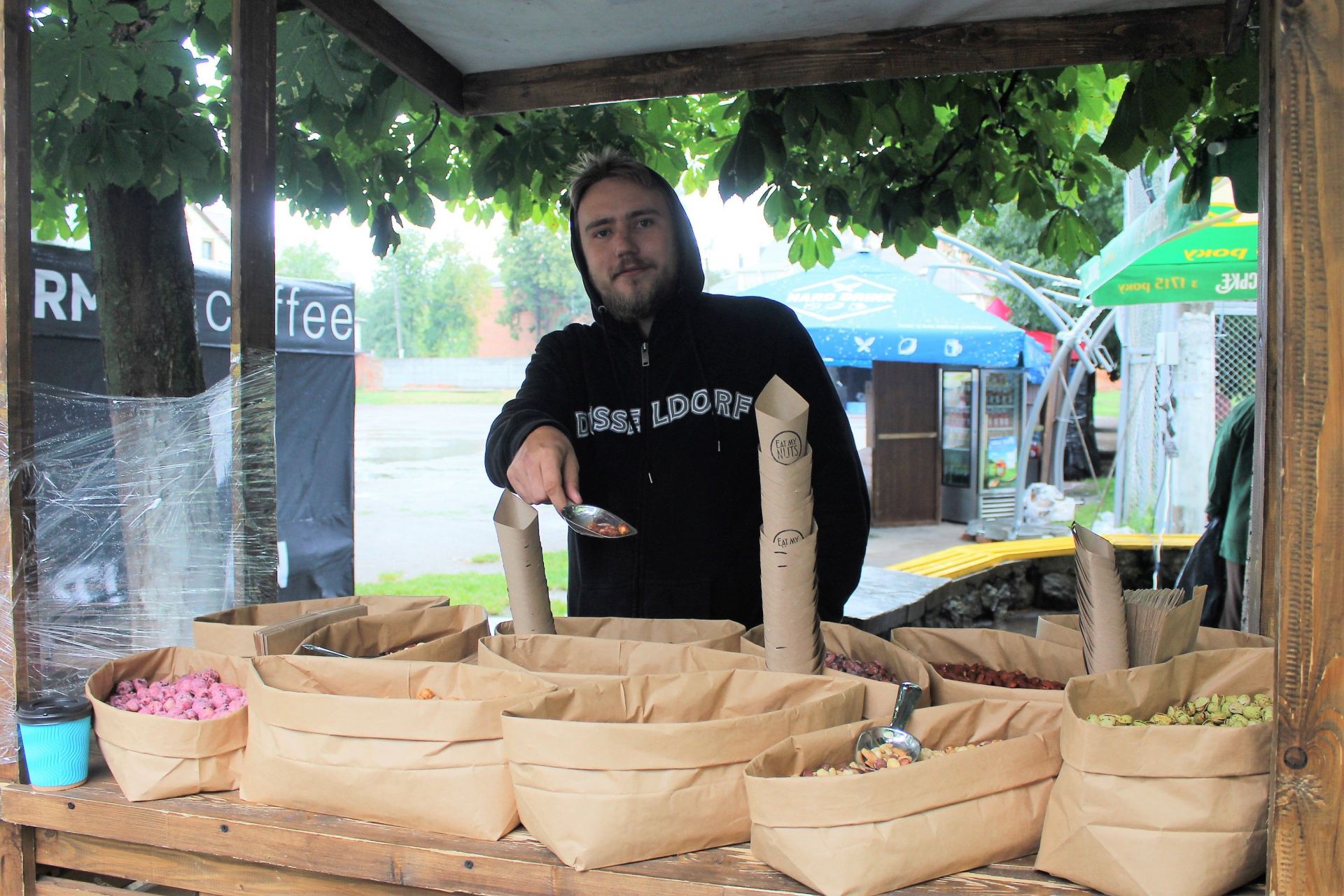 Ближче до стадіону знаходяться палатки львів’ян. Сюди привезли «Смажений горіх», де є дивовижні горішки з додаванням білого шоколаду, журавлини, трюфелю та інших домішок. Як солодкі, так і солодкі смажені горіхи вартують 70 гривень за порцію.