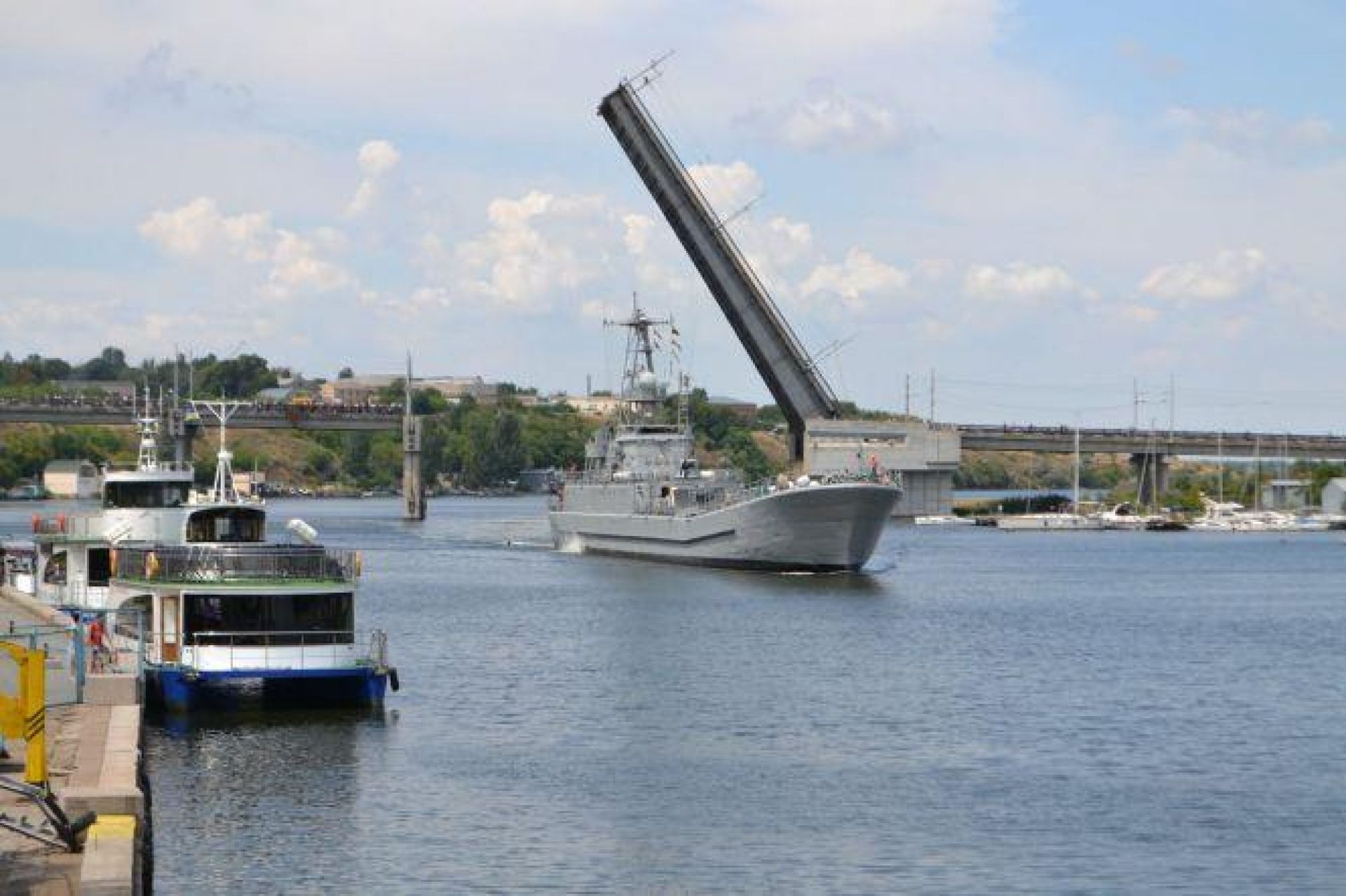— Це єдиний в Україні міст з горизонтальною системою розведення для проходження суден, — каже Олександр Лагошняк. — Його довжина 750 метрів, якщо врахувати ще насипну частину, то загалом виходить майже два к кілометри. Ширшого моста також нема на річці, ніж у Миколаєві. Для проїжджої частин відведено 10,5 метра, решта для пішохідних тротуарів, таким чином загальна ширина становить 15,7 метра.