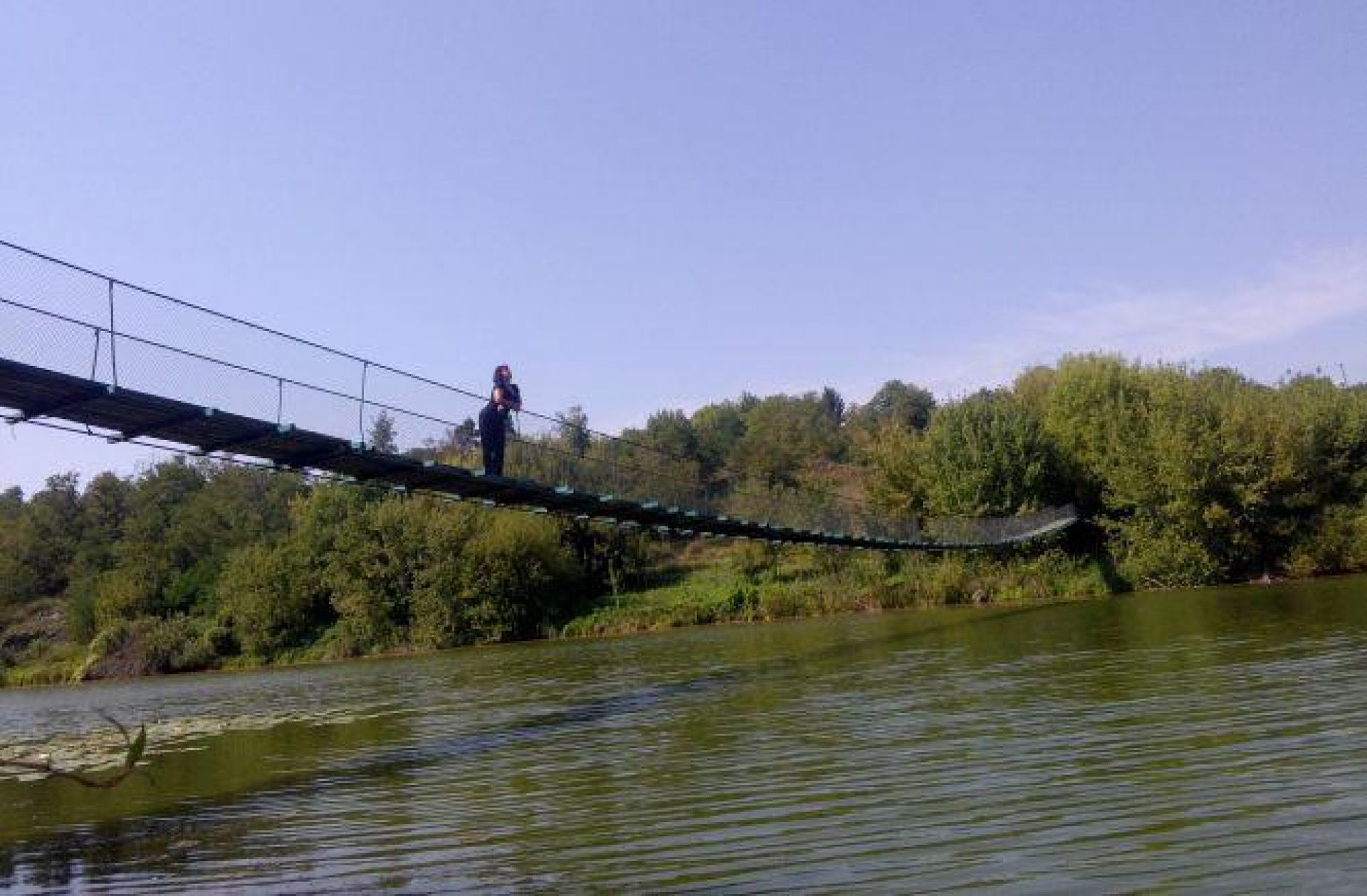 Йдеться про підвісну пішохідну переправу. Вона тримається на тросах і линвах, які прикріплені до металевих стовпів, встановлених на обох берегах річки. До води 3-5 метрів: посередині прогинається до трьох метрів, біля берегів відстань трохи більша. Довжина такої переправи 100 метрів, ширина 1,3 метра. Замість перил також використали троси, натягнуті між берегами. Бокова огорожа зроблена з сітки-«рабиці». Прогонна частина прокладена з дощок, товщиною 30 міліметрів.