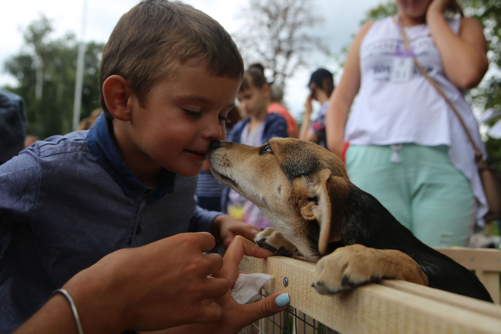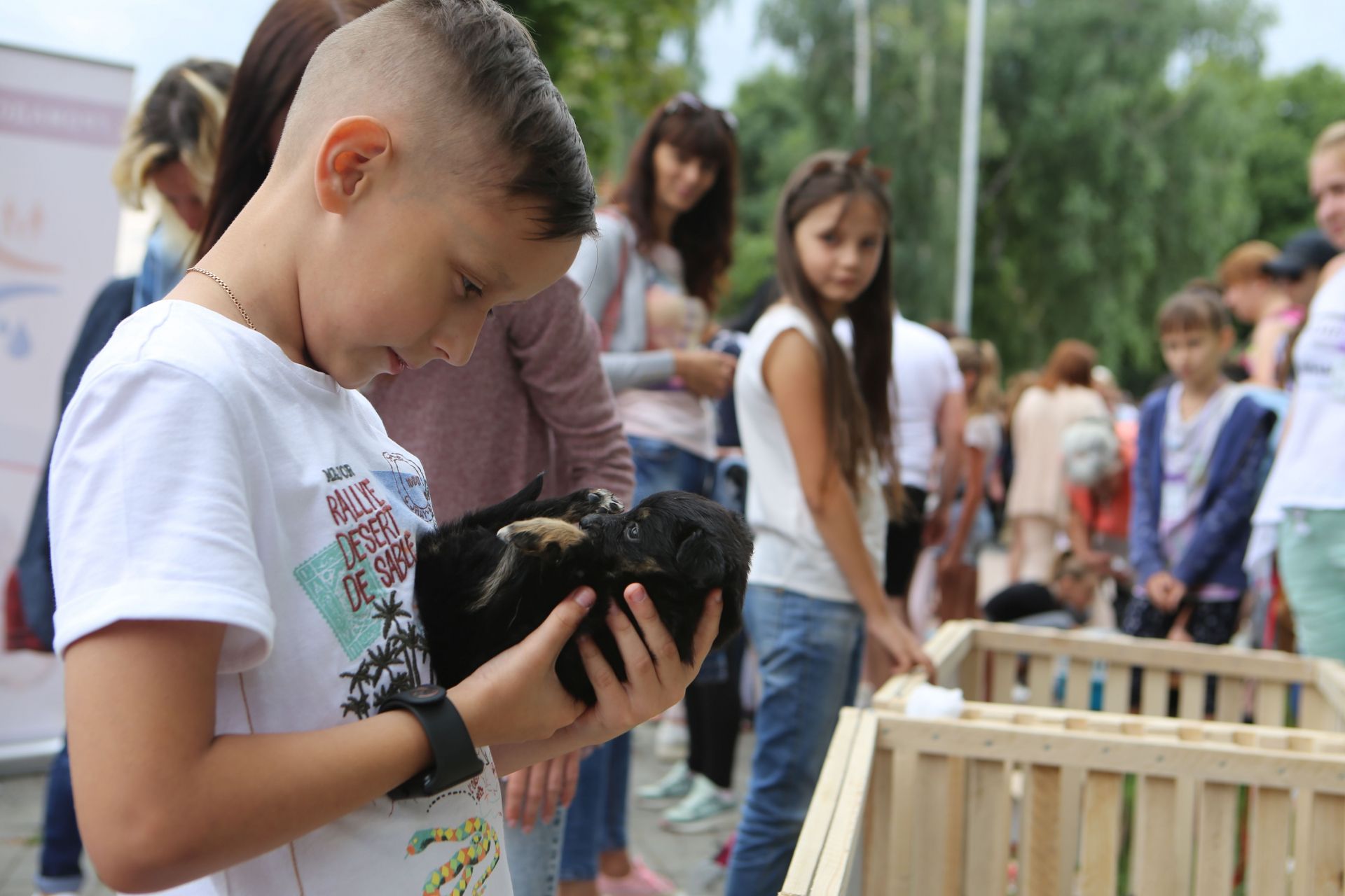 Надія працює у притулку для тварин «Планета». На фестивалі жінка вже вдруге. Перед нею п'ять цуценят та три чорні котика. Каже, що минулого разу забрали одне цуценя та одне кошеня. Попит більше на хлопчиків, тому у клітці залишилися сидіти тільки дівчатка.