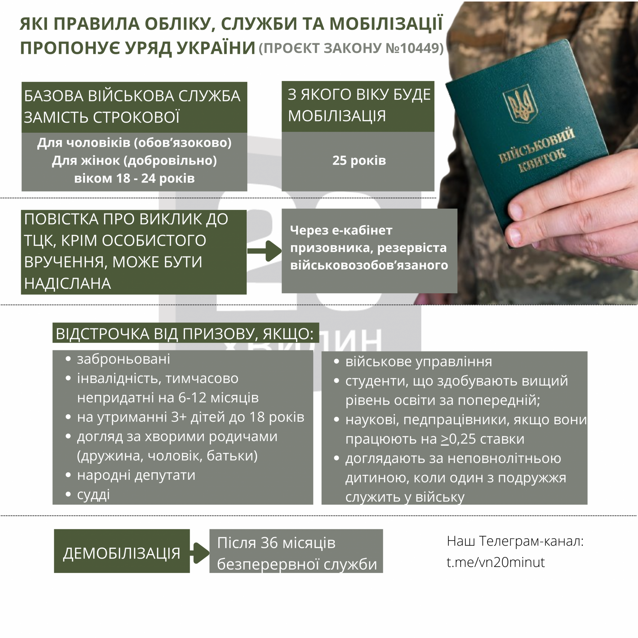 - Ним передбачається демобілізація для чинних військових після трьох років служби, зміни у мобілізації студентів, які отримують другу і наступну вищу освіту. А також появу електронних повісток.