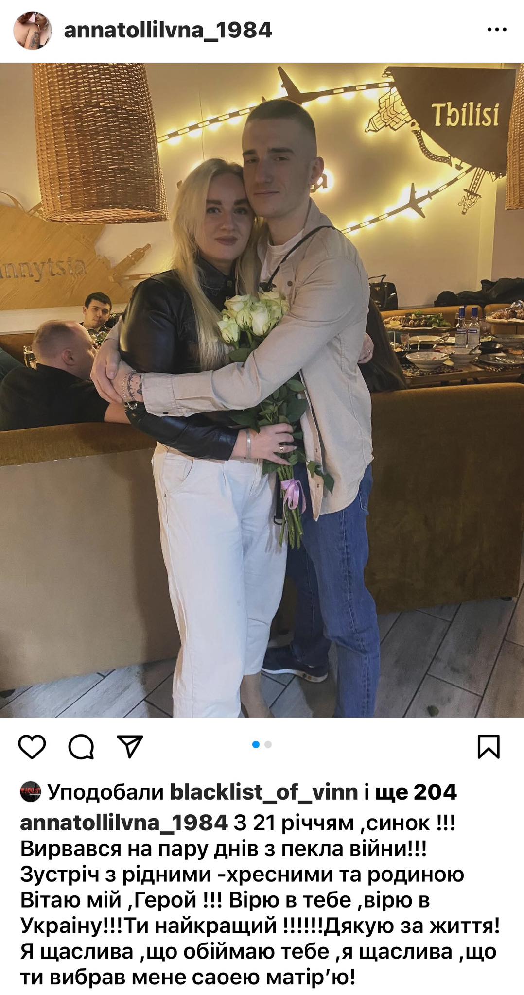 «З 21 річчям, синок!!! Вирвався на пару днів з пекла війни!!! Зустріч з рідними, хресними та родиною Вітаю, мій Герой !!! Вірю в тебе, вірю в Україну!!!Ти найкращий !!!!!!Дякую за життя!Я щаслива,що обіймаю тебе, я щаслива, що ти вибрав мене своєю матірʼю!».