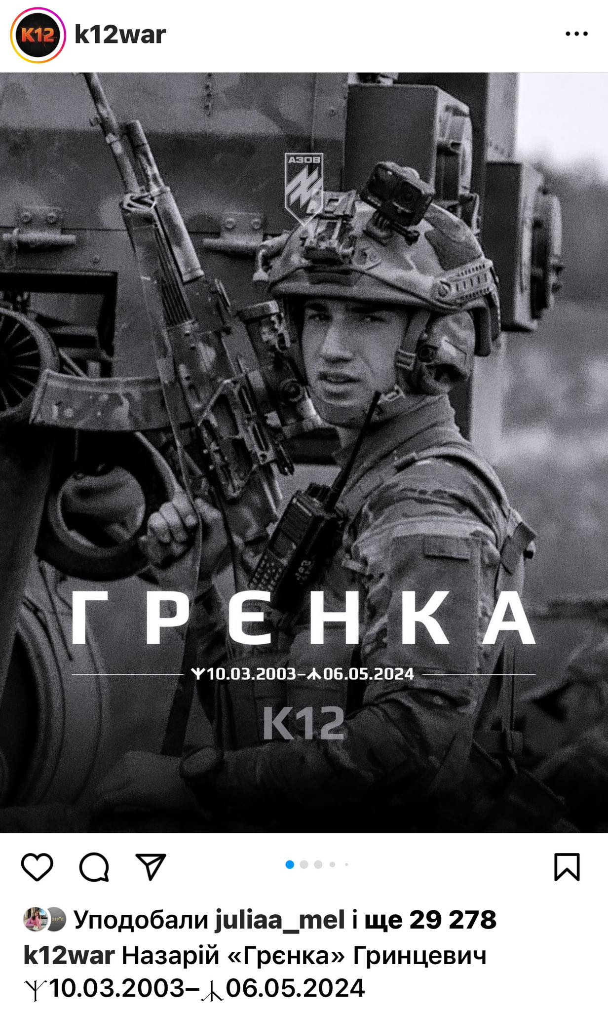 «В бою за Україну загинув наш друг, засновник К12, учасник оборони Маріуполя, азовець Назарій «Грєнка» Гринцевич.Вагу цієї втрати для кожного з нас і для України неможливо описати словами. «Грєнка» — безстрашний учасник вуличної боротьби за Україну з малих років, згодом — азовець, який пройшов запеклі бої оточеного Маріуполя, отримав поранення, пройшов ворожий полон і повернувся в стрій. Своєю безграничною енергією і натхненням він вів за собою десятки та надихав тисячі людей. І його приклад вічно світитиме майбутнім поколінням. Найкращий друг. Лідер. Легенда. Помстимося».