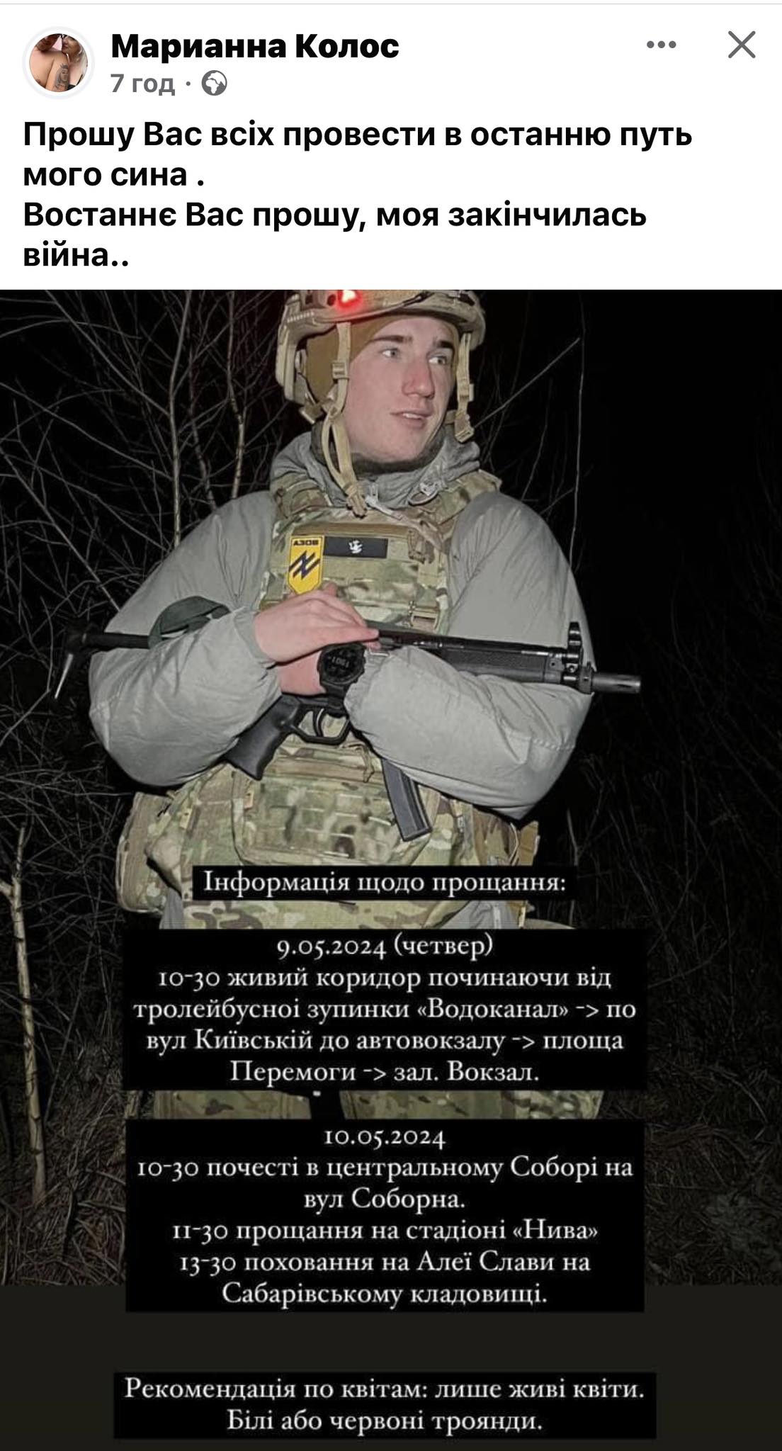 Мама Героя, Маріанна Колос, у своєму дописі на Фейсбук просить вінничан провести в останню путь її сина.