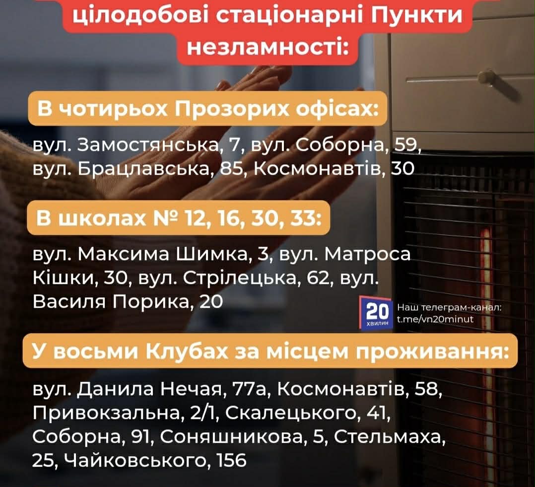 За інформацією міськради, за останні дві доби Пунктами незламності у Вінниці скористалися 140 людей, з них 37 у вечірній та нічний час. Найчастіше містяни звертаються до мобільних пунктів і Прозорих офісів у районах Старого міста та Замостя. Пункти відкриті для всіх, кому під час відключень потрібні тепло, зв’язок і безпечний простір.