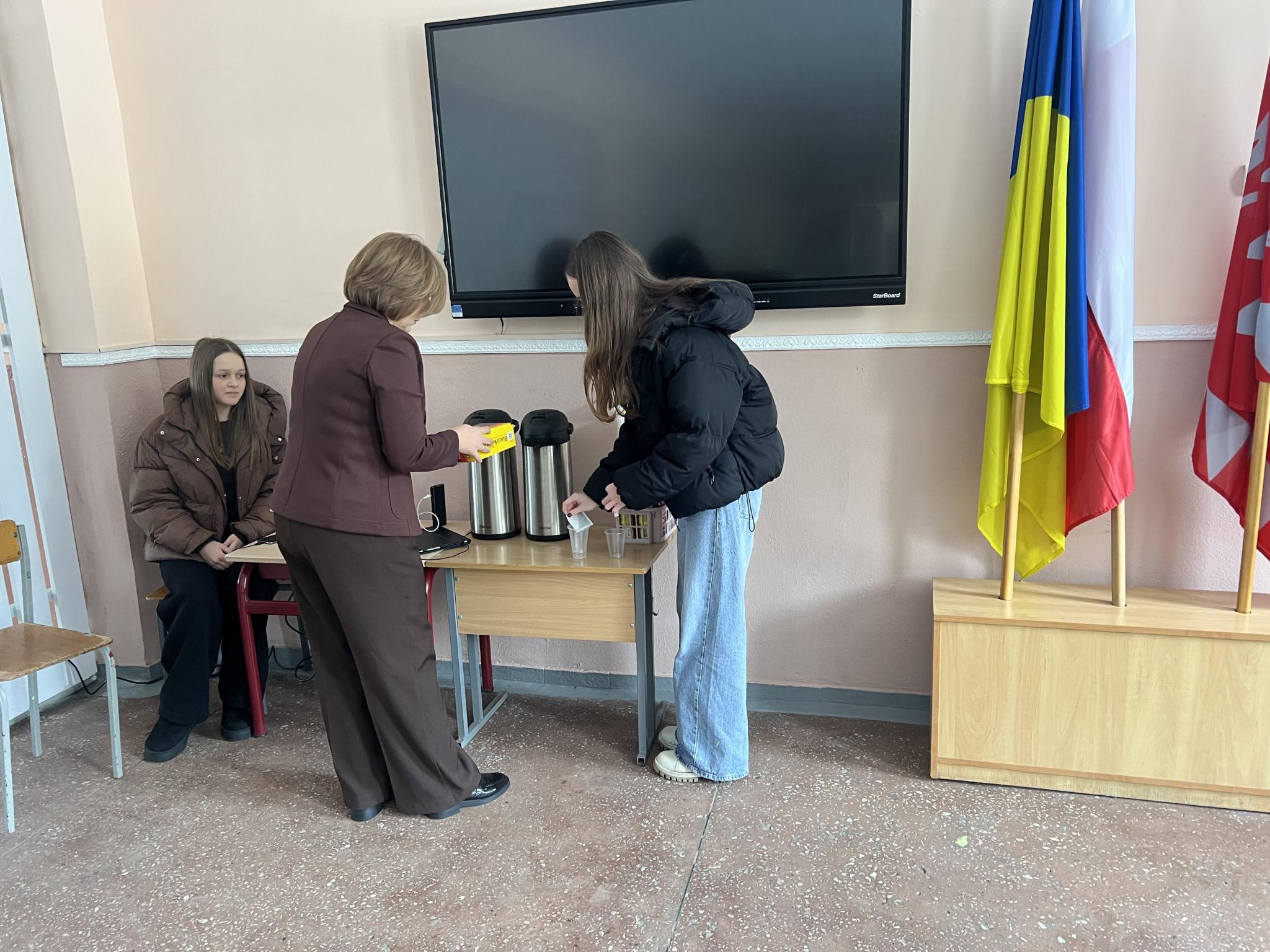 В ліцеї тепло й світло. На столах – термопот і чайник, поруч чай та кава. А до гарячих напоїв – печиво. Працює Wi-Fi, уздовж стін подовжувачі з розетками для зарядки гаджетів. У кутку ковдри. Увімкнене радіо, працює генератор.