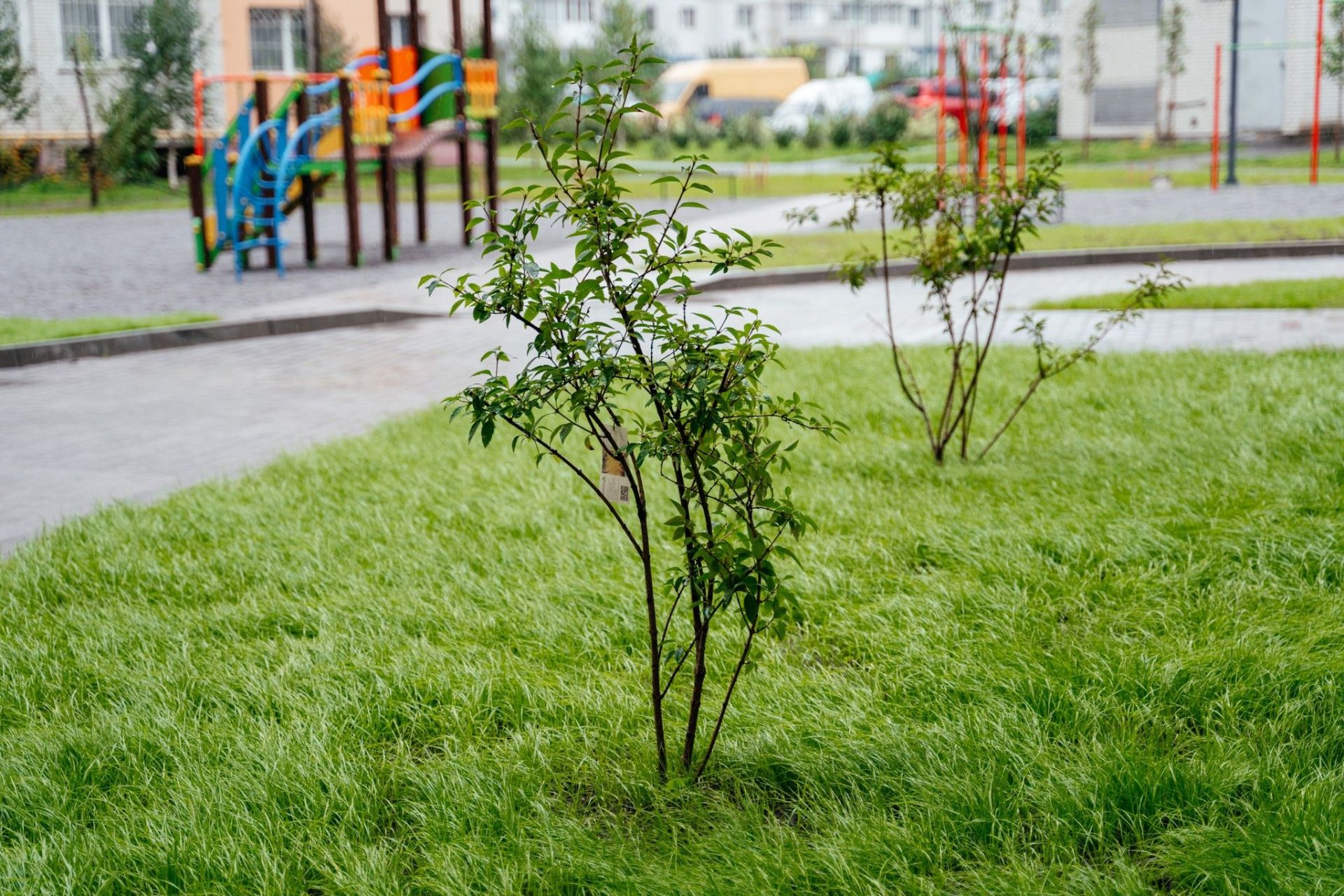 В дворі будинку уже повністю виконане озеленення, висаджені 28 дерев. Є також є дитячий майданчик та підземний паркінг.