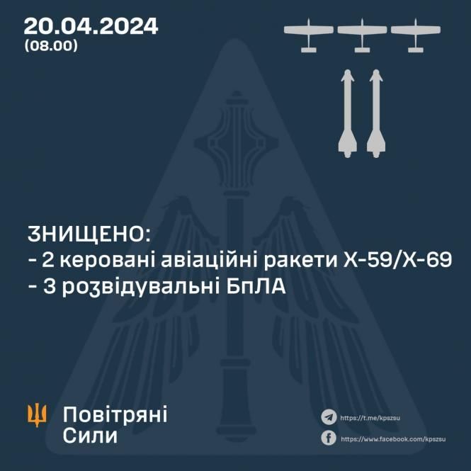 У ніч на 20 квітня 2024 року російські окупанти атакували Україну трьома балістичними ракетами «Іскандер-М», двома зенітними керованими ракетами С-300/С-400, а також двома керованими авіаційними ракетами Х-59/Х-69.