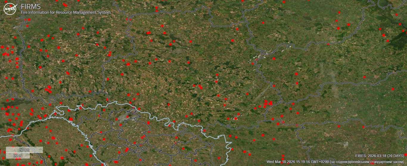 • Про масштаб проблеми свідчать і супутникові карти пожеж: якщо до кінця лютого в регіоні не фіксували займань, то за останні тижні їхня кількість сягнула кількох десятків.