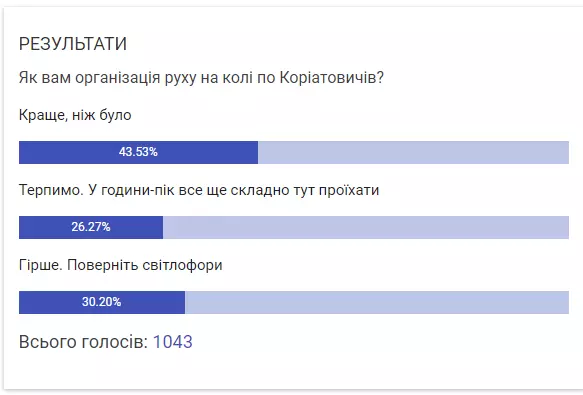 Рік тому на перехресті Оводова-Коріатовичів запустили кільцеву розв’язку: світлофори на перехресті вимкнули, а замість них поставили дорожні блоки, які імітують коло. У мерії захотіли перевірити, чи вдасться так зменшити затримки транспорту та завантаженість цього перехрестя.