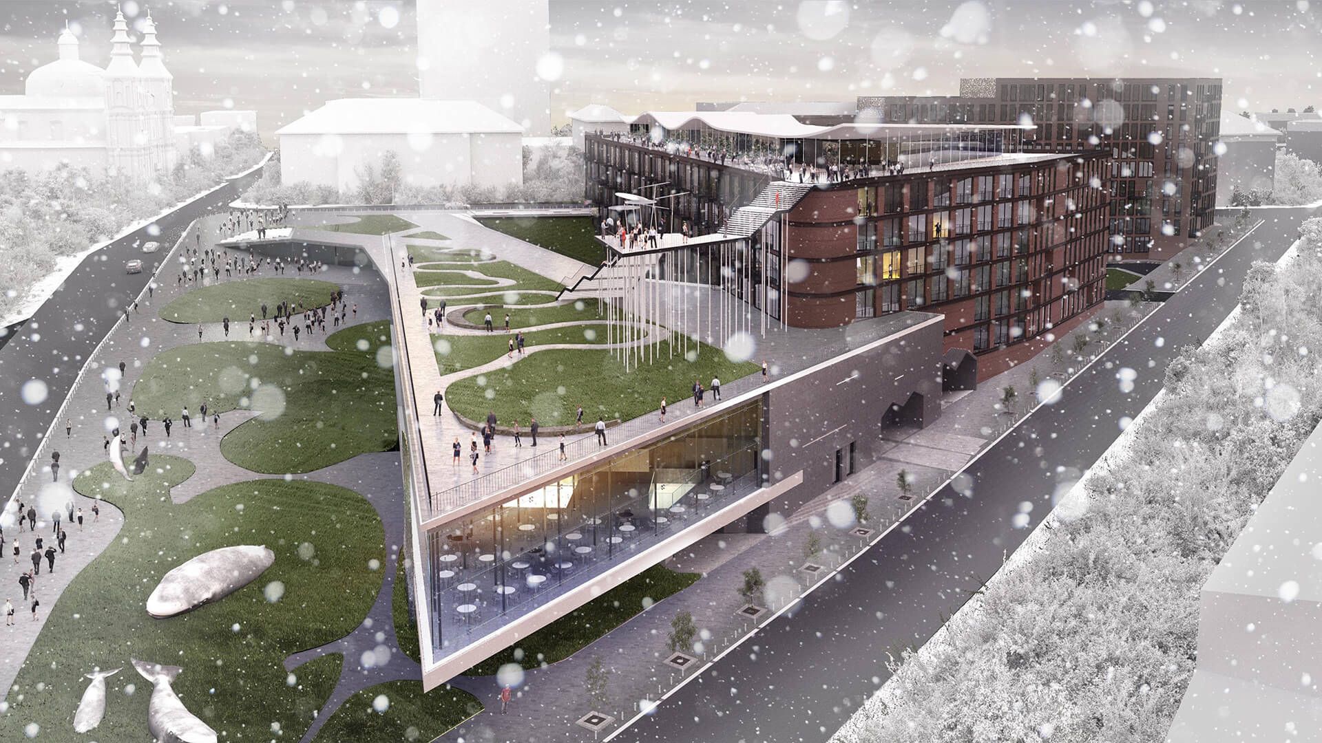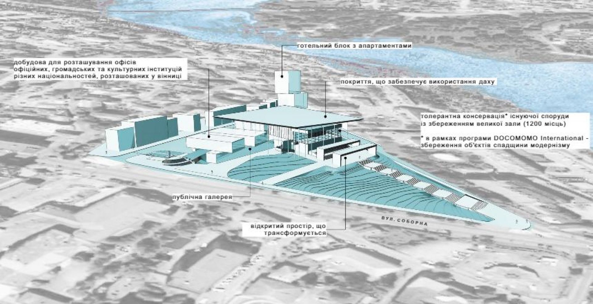 — Проект направлений на створення простору для взаємодії офіційних, громадських та культурних інституцій різних національностей. Цінність кіноконцертної зали на 1200 місць в споруді пізнього модернізму підсилюється будівництвом блоку офісних приміщень та публічної галереї. На розі вулиць Магістратської та Визволення розташовується готель, — йдеться в описі проекту.