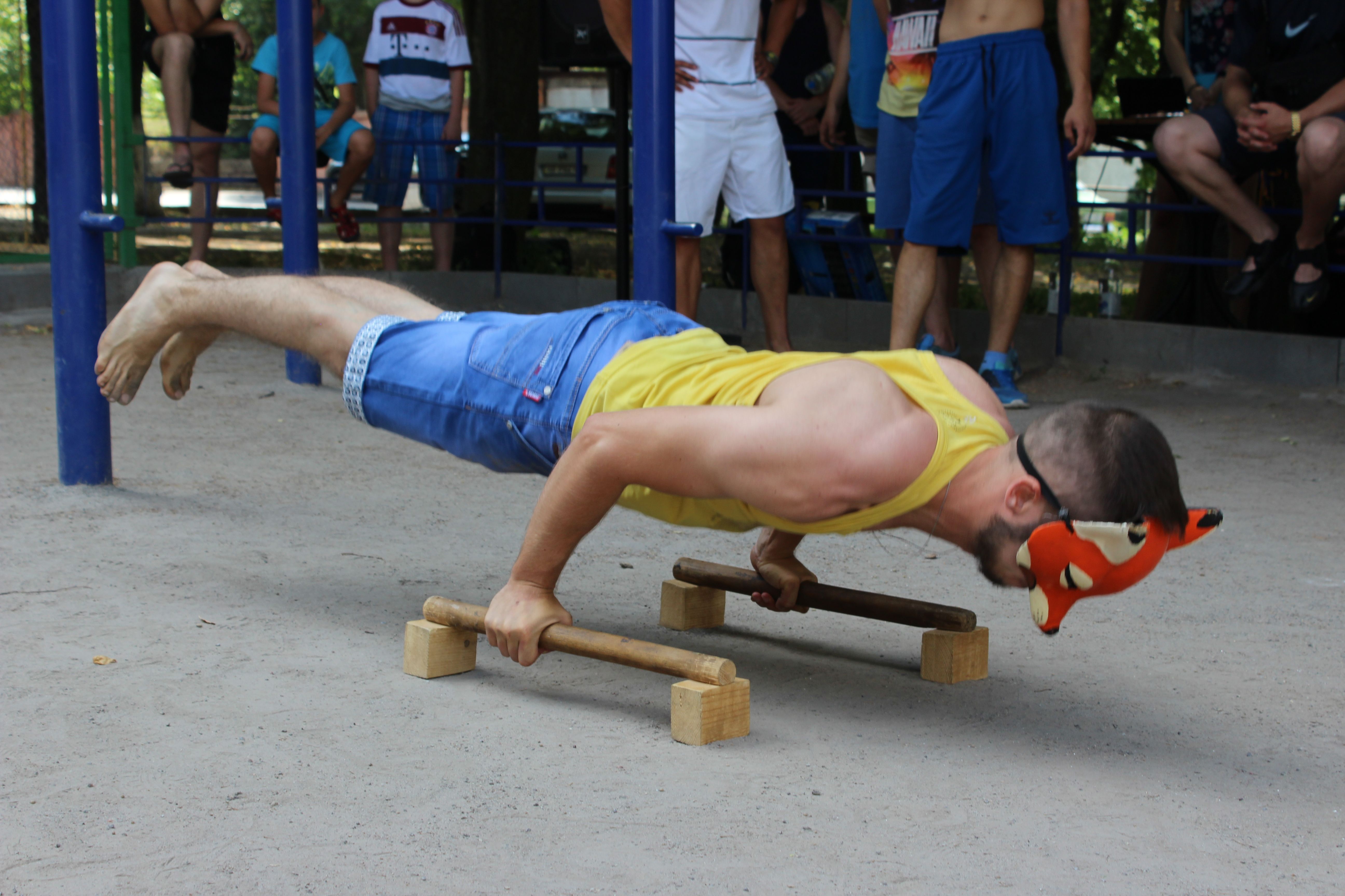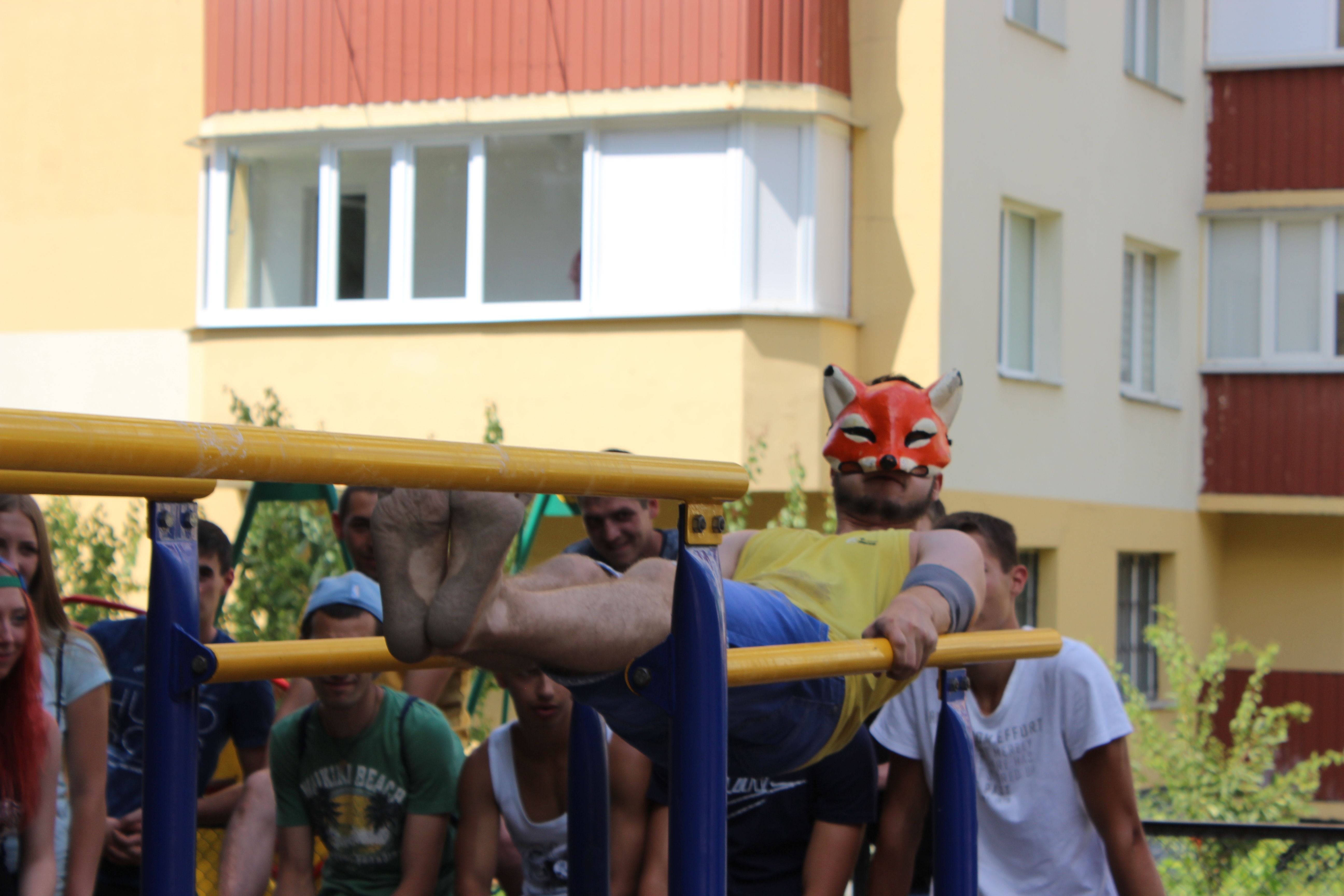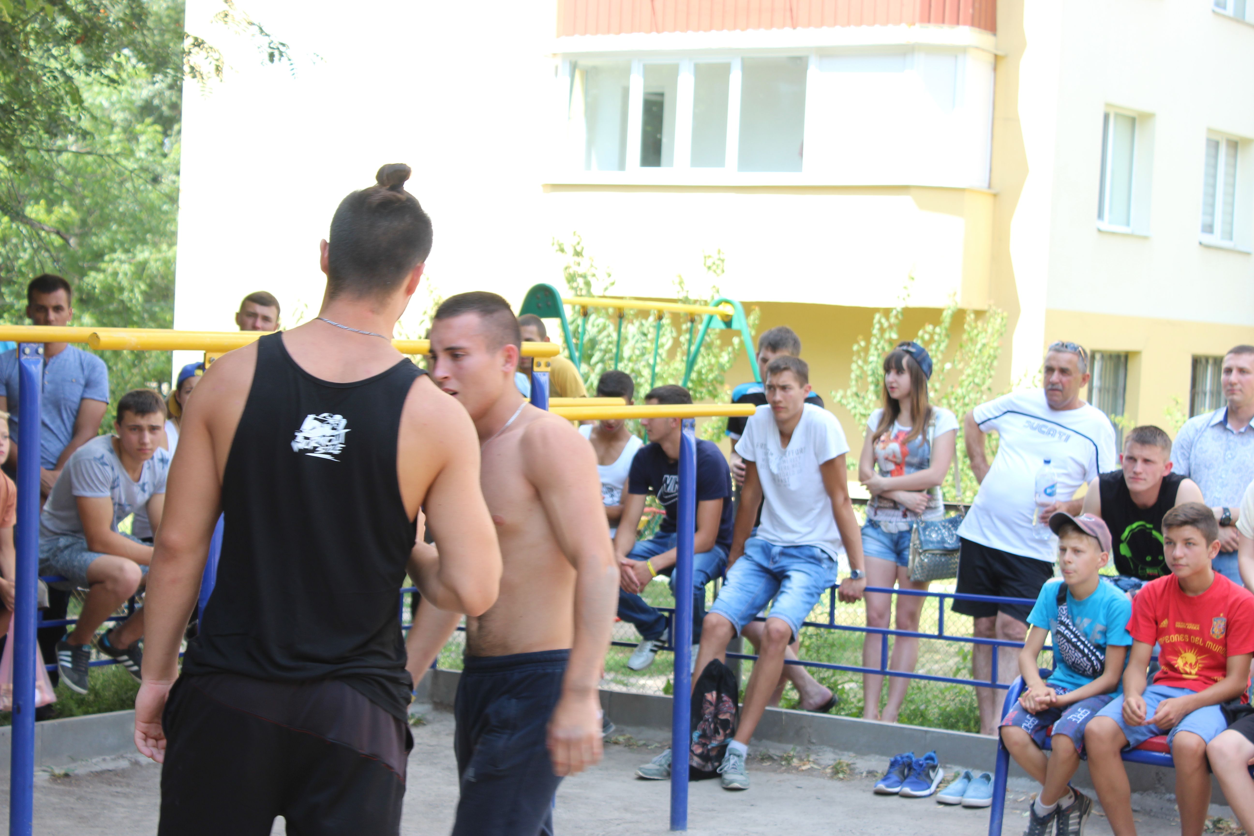 Спека на майданчику неймовірна. Ті турніки, що не в затінку, немов розпечене залізо. Але конкурсантів це немовби-то й не лякає - спокійнісійнько розминаються перед виступами. - Хто бажає на командні підтягування, підходьте. Тут команді двох людей не вистачає… - зазивають людей реєстратори.