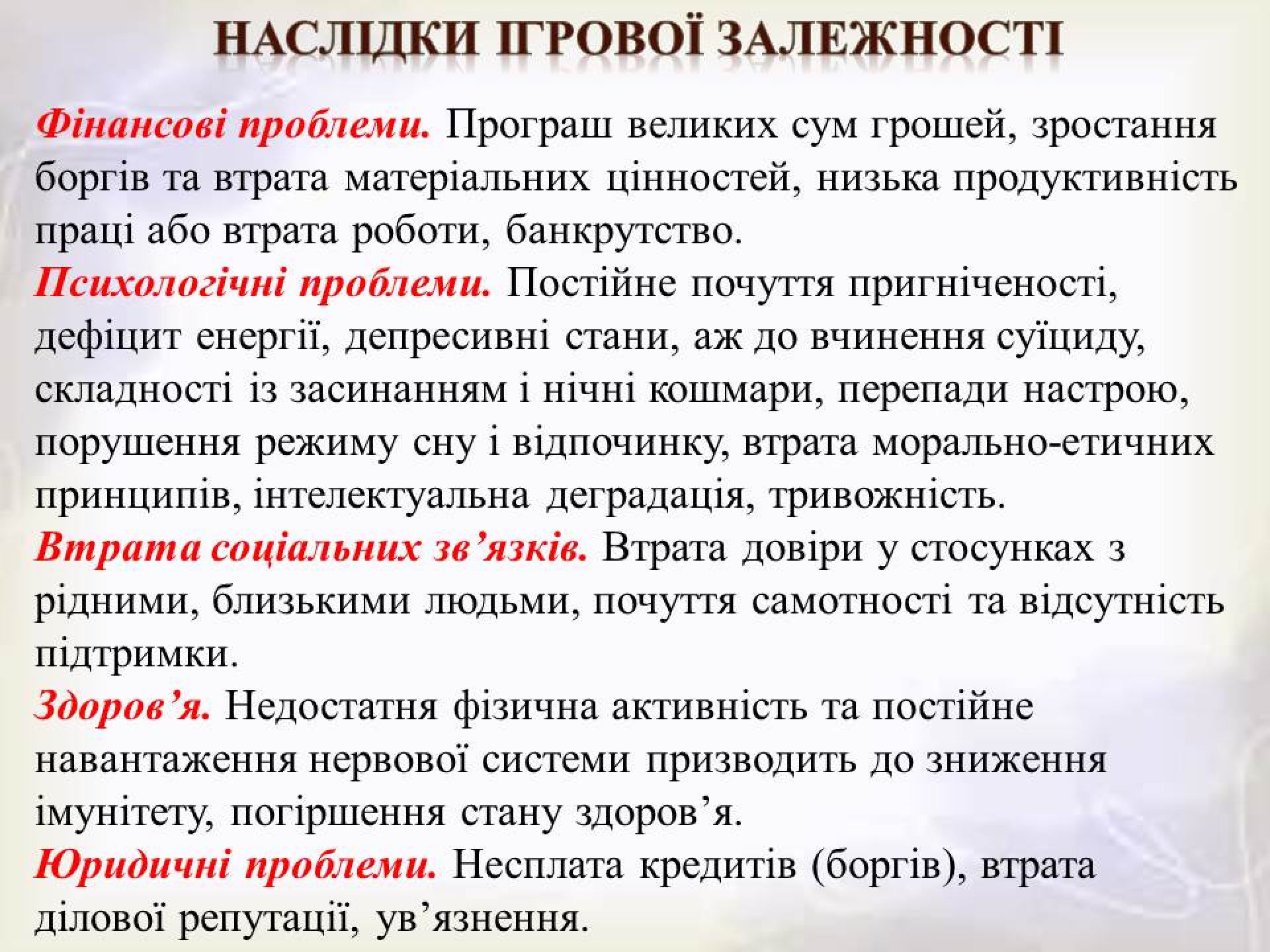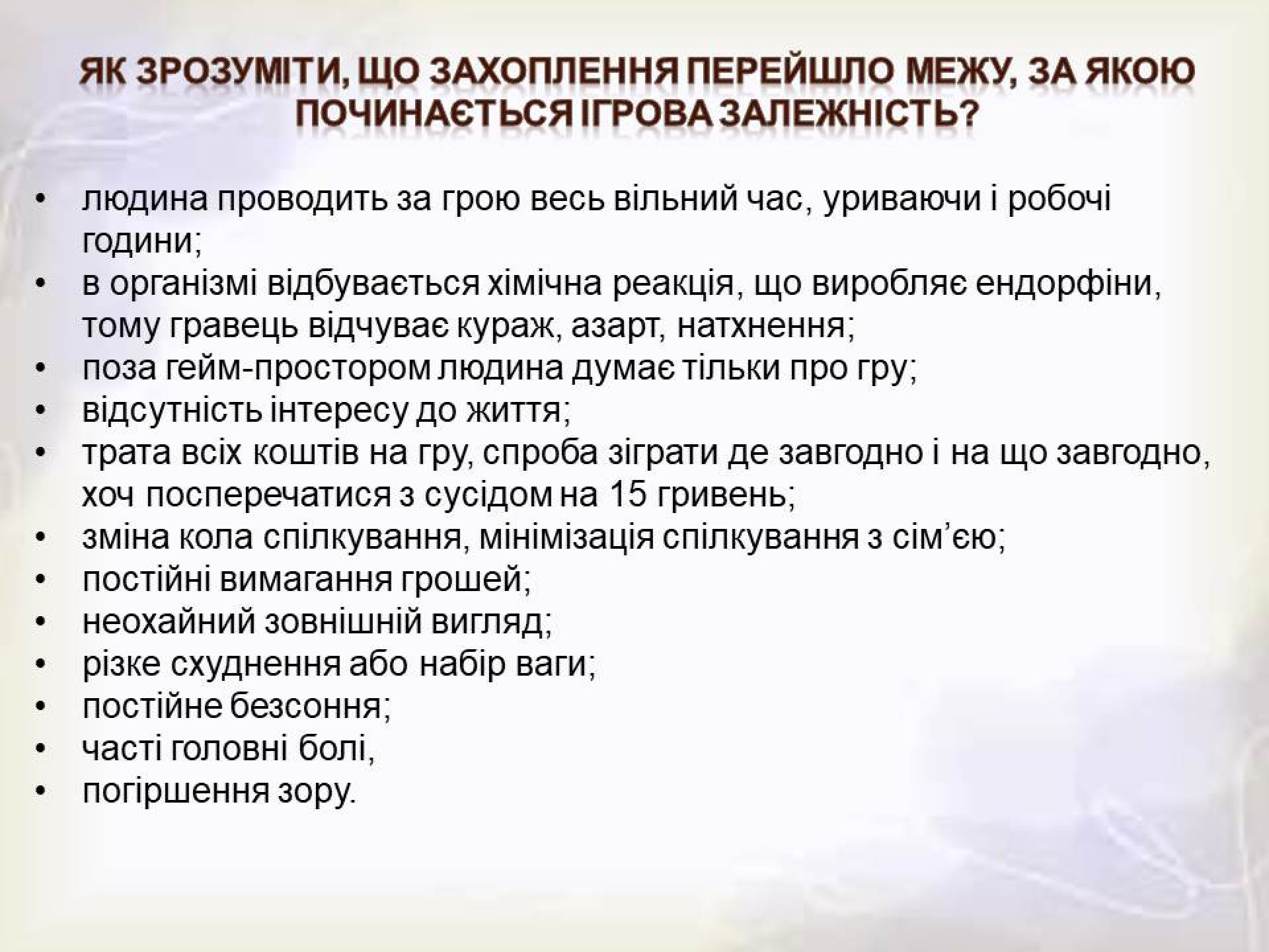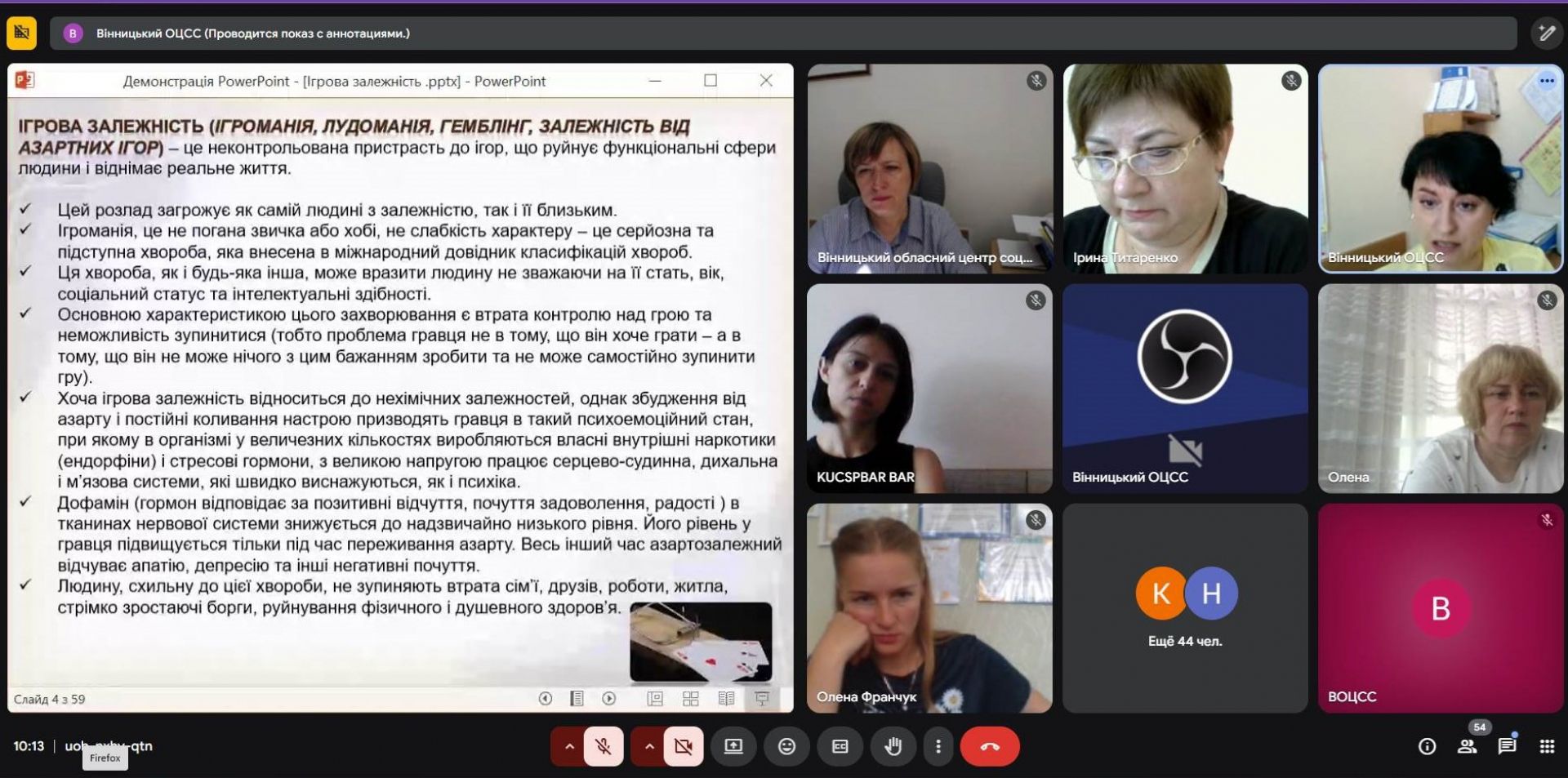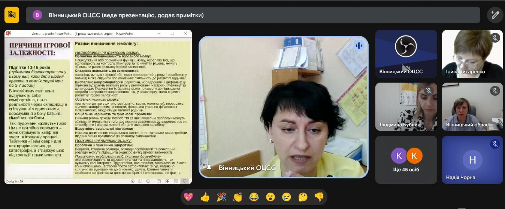Методистка обласного центру соціальних служб Марина Сорочан пояснила, що ігрова залежність — це неконтрольована пристрасть до азартних ігор, яка руйнує життя людини. Це серйозна хвороба, внесена до міжнародного довідника класифікацій хвороб. Її головна ознака — втрата контролю над грою та нездатність зупинитися.