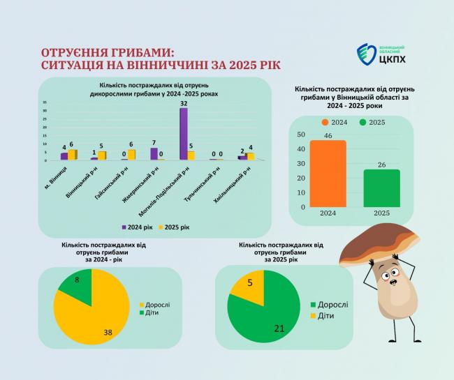 - Вінниця: у 2025 році – 6 постраждалих (у 2024 році – 4). Причини: дикорослі гриби, консервовані гриби, а також один випадок отруєння мухоморами, привезеними з-за кордону.