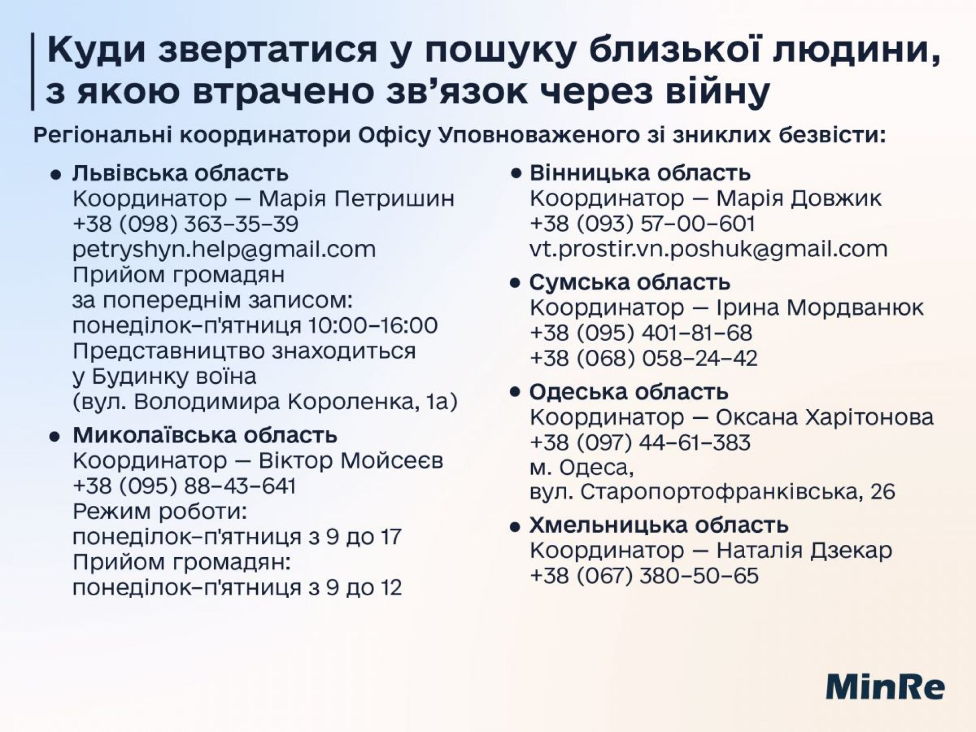Зараз додалися ще стільки ж. Розпочали роботу координатори на Вінниччині, Сумщині, Одещині, Хмельниччині та Миколаївщині. А також оновились контакти координаторки на Львівщині, яка почала працювати серед перших, повідомляє Міністерство з питань реінтеграції тимчасово окупованих територій України.