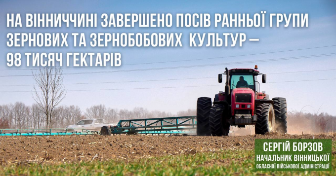 На Вінниччині завершено посів ранньої групи зернових та зернобобових культур, повідомив голова Вінницької ОВА Сергій Борзов.