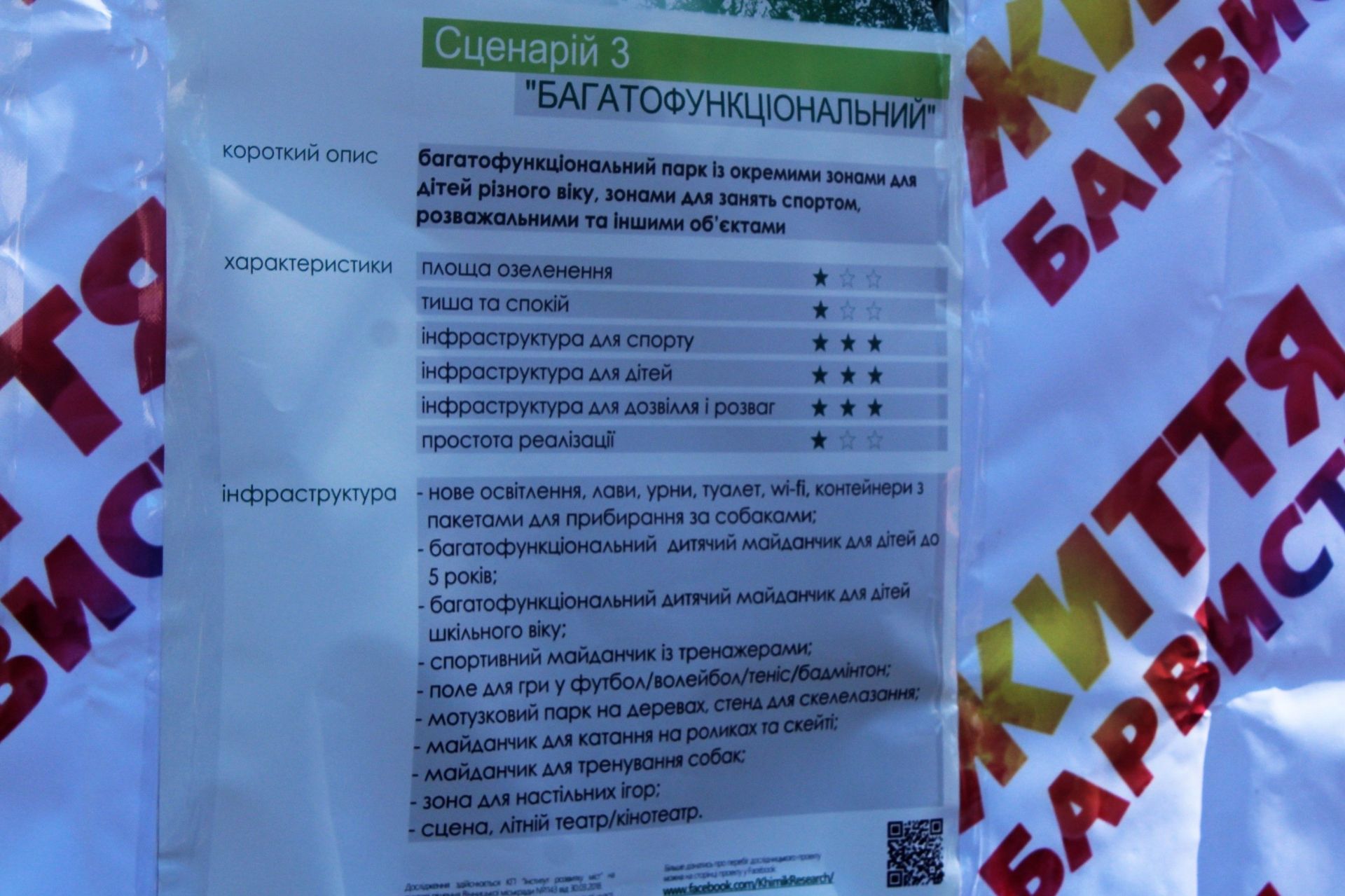 У неділю, 22 квітня, знову зібралися на обговорення про майбутнє «Хіміку». Жителям мікрорайону представили три варіанти розвитку парку, які відрізнялися кількістю ігрових майданчиків, зелені та простотою реалізації. Чим більше усіляких розваг — тим менше залишається озеленення та більше ресурсів доведеться витратити на створення нового парку.