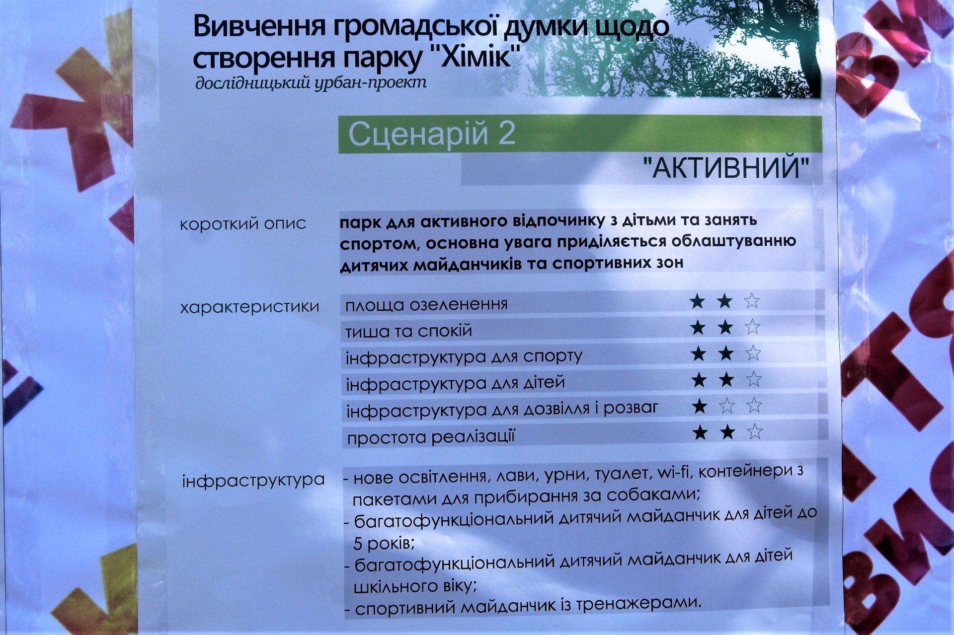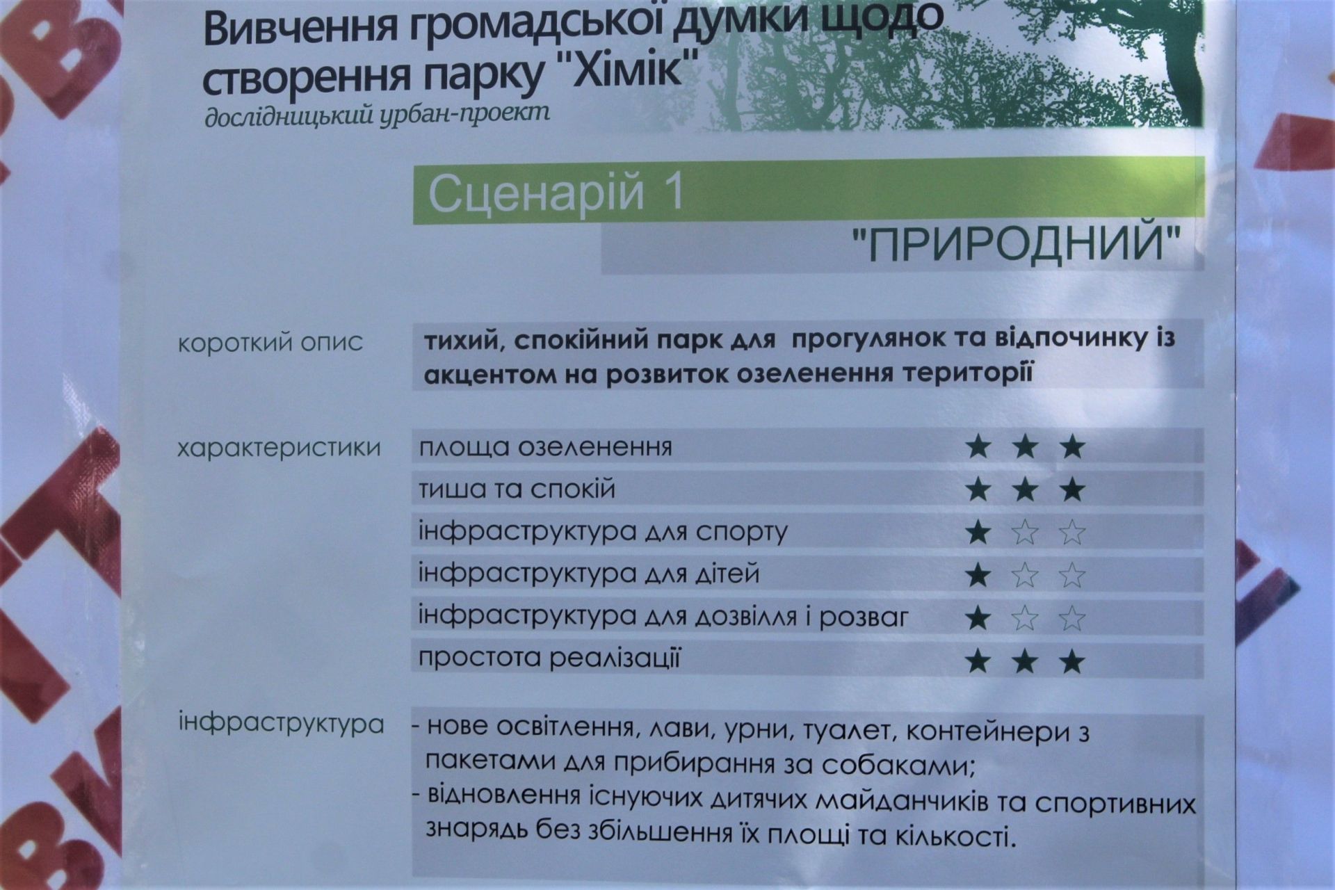 — Надалі ми запитаємо й інші зацікавлені сторони — працівників спорткомплексу, міську раду, представників релігійної громади, працівників офісів, що знаходяться у колишньому будинку культури поряд з парку. Це треба аби охопити всі думки та сформувати план розвитку парку Хімік, — пояснила керівниця КП «Інститут розвитку міст» Аліна Дяченко.