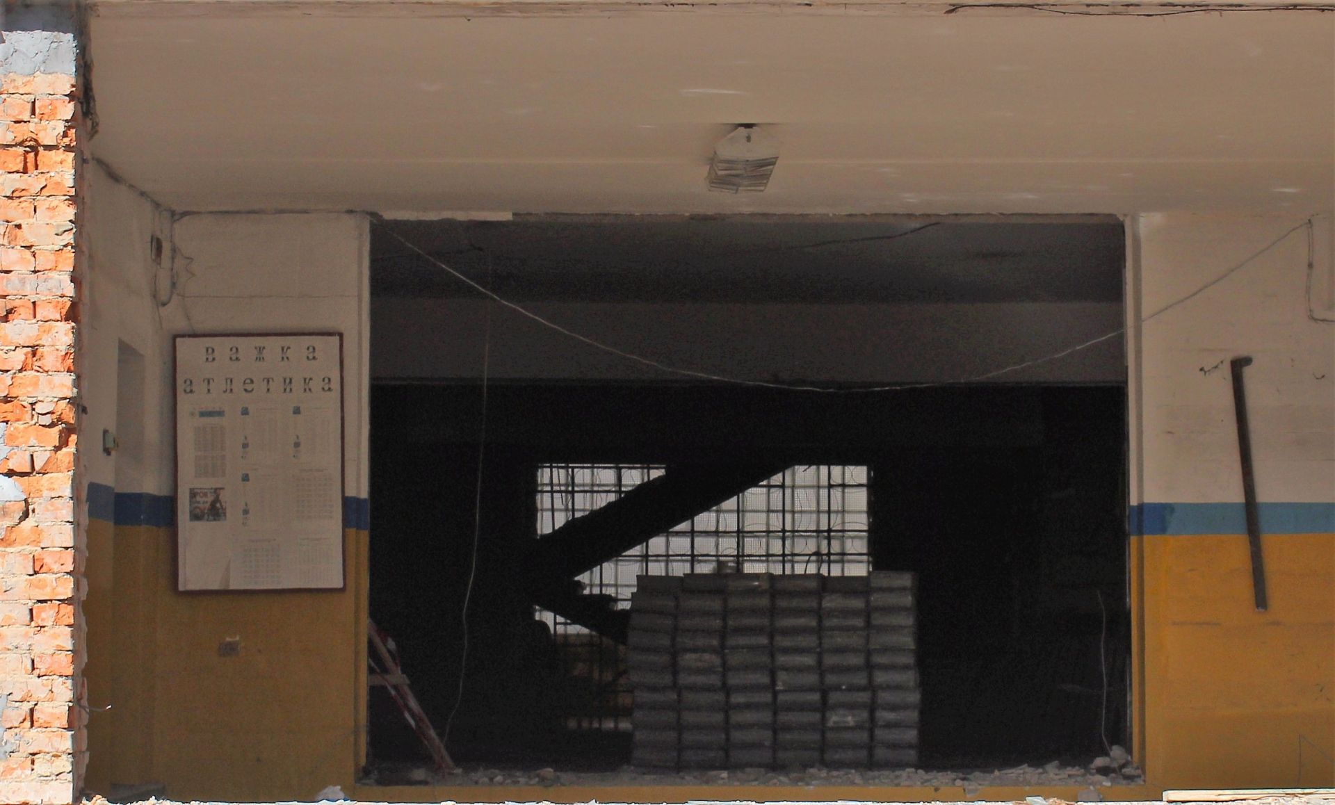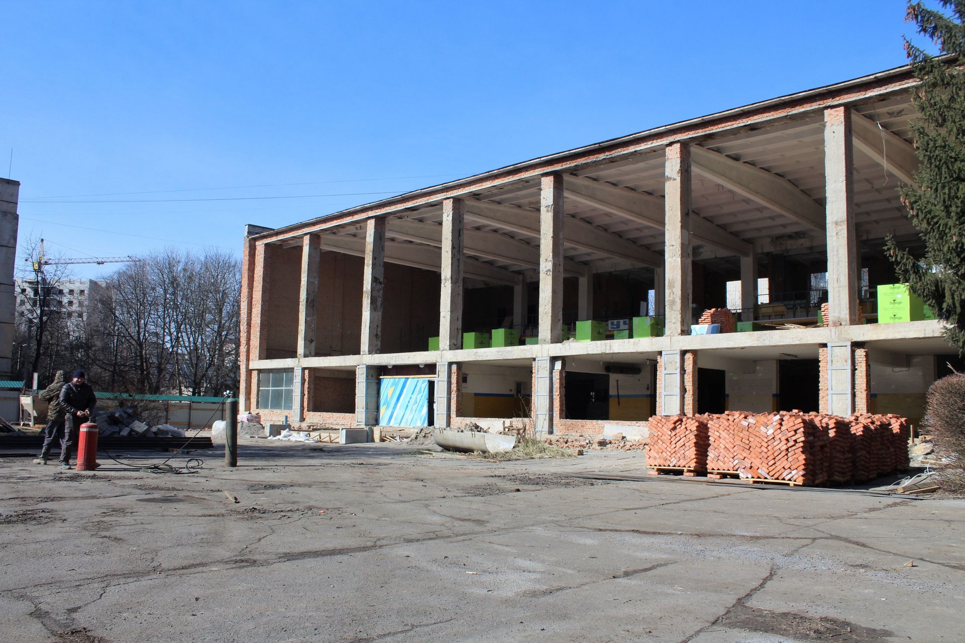Територія навколо спорткомплексу огороджена парканом. Всередині спорткомплексу працюють робітники, поблизу будівлі — сміття і залишки цегли.