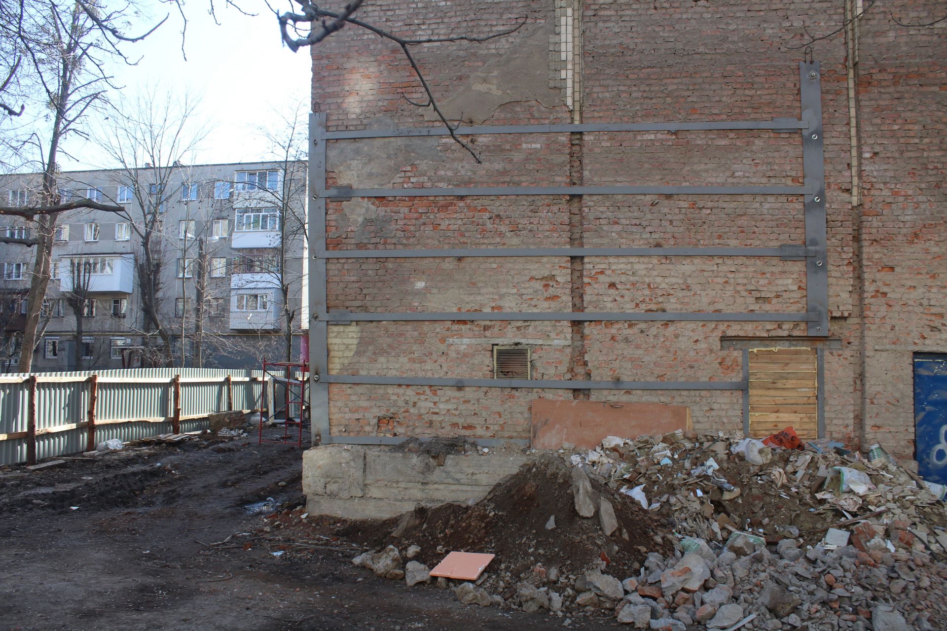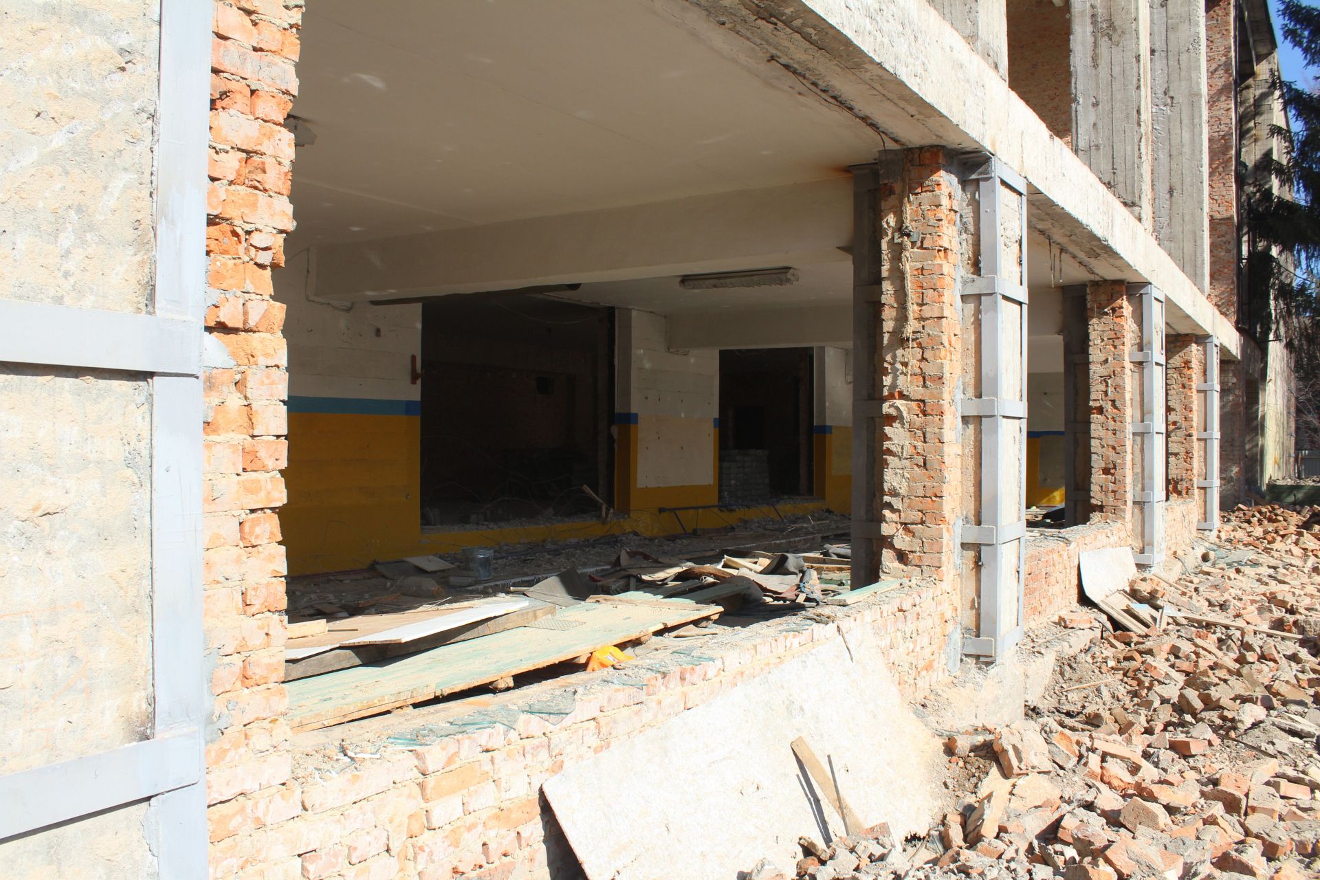 З фасаду об’єкту вже зняли вікна та частину стін. А позаду видно, що стіни стягнули між собою сталевими смугами.