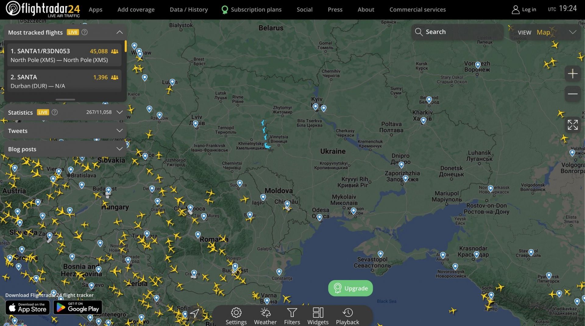 А Командування Повітряних сил ЗСУ опублікувало скріншот мапи проєкту Flightradar24, на якому олені Санти «пролетіли» над Вінницею.