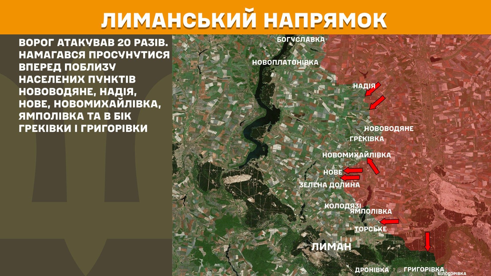 На Лиманському напрямку ворог атакував 20 разів. Намагався просунутися вперед поблизу населених пунктів Нововодяне, Надія, Нове, Новомихайлівка, Ямполівка та в бік Греківки і Григорівки.