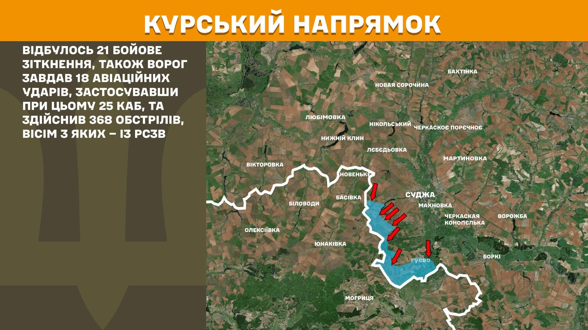 У Курській області минулої доби відбулося 21 бойове зіткнення, також ворог завдав 18 авіаційних ударів, застосувавши при цьому 25 КАБ, та здійснив 368 обстрілів, вісім з яких – із РСЗВ.