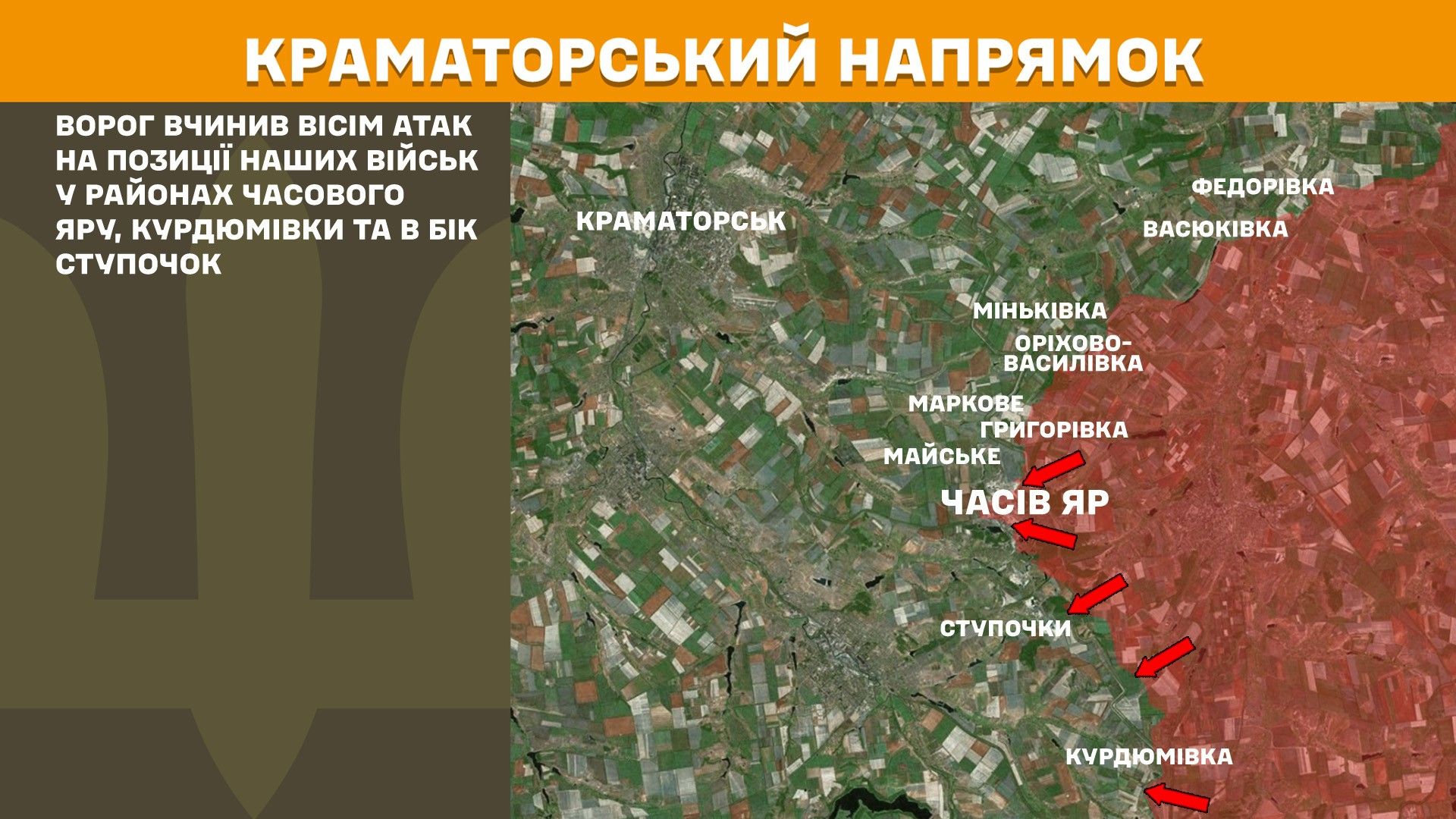 На Краматорському напрямку ворог вчинив вісім атак на позиції наших військ у районах Часового Яру, Курдюмівки та в бік Ступочок.