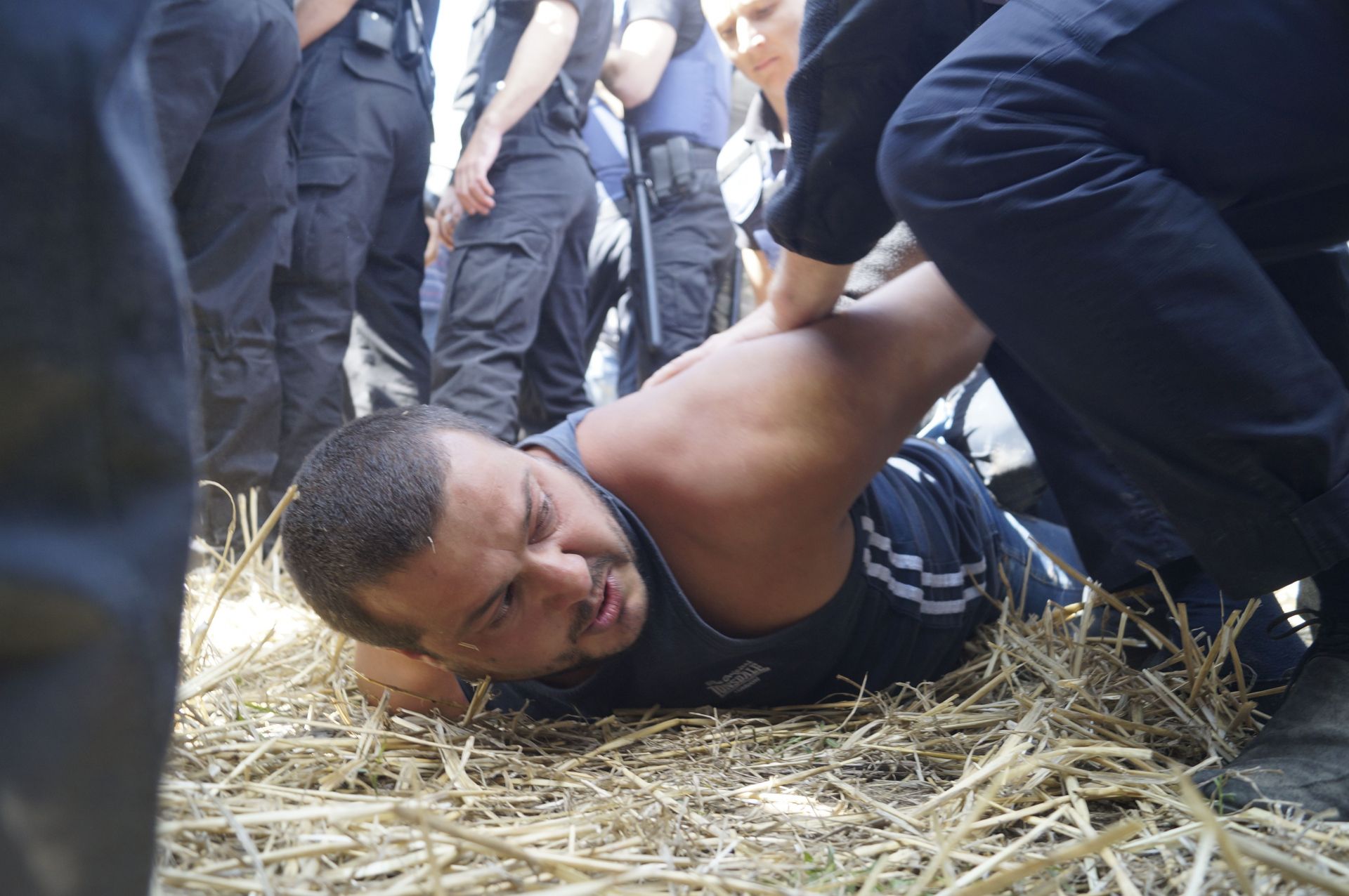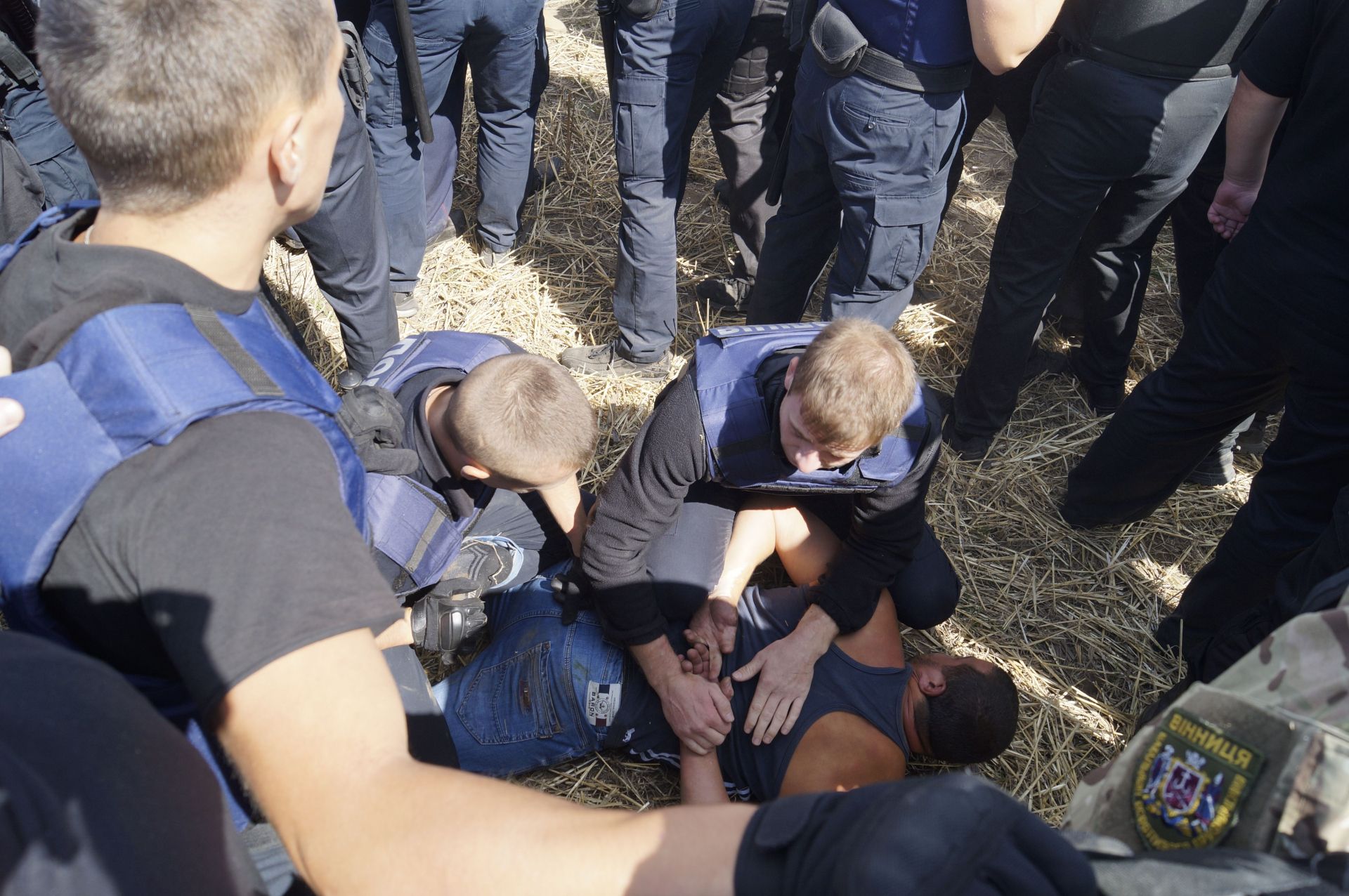 Заступник начальника вінницької поліції Сергій Синявський побачив в одного з активістів газовий балончик, і поліція, взявши його в кільце, скрутила і повалила на землю.