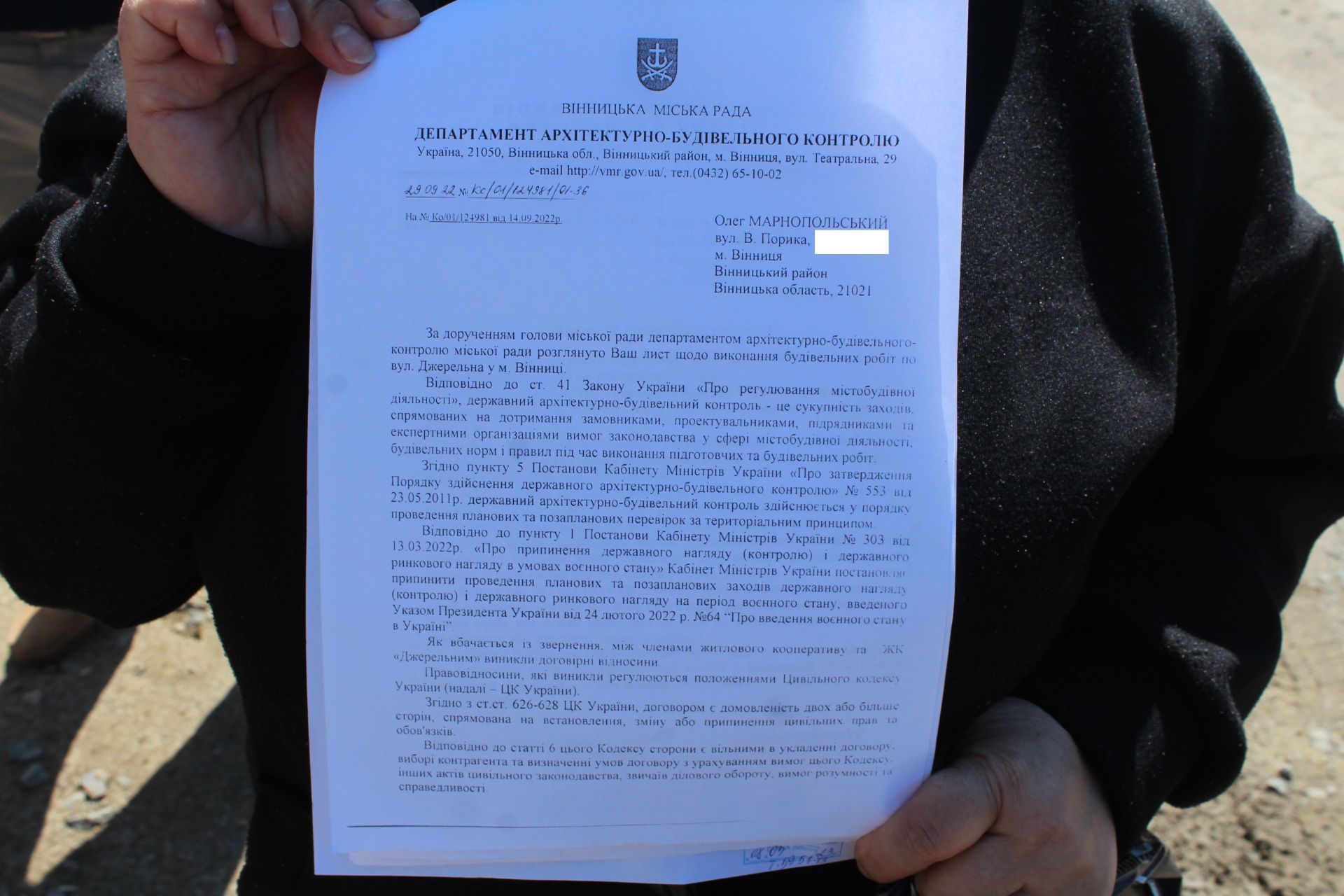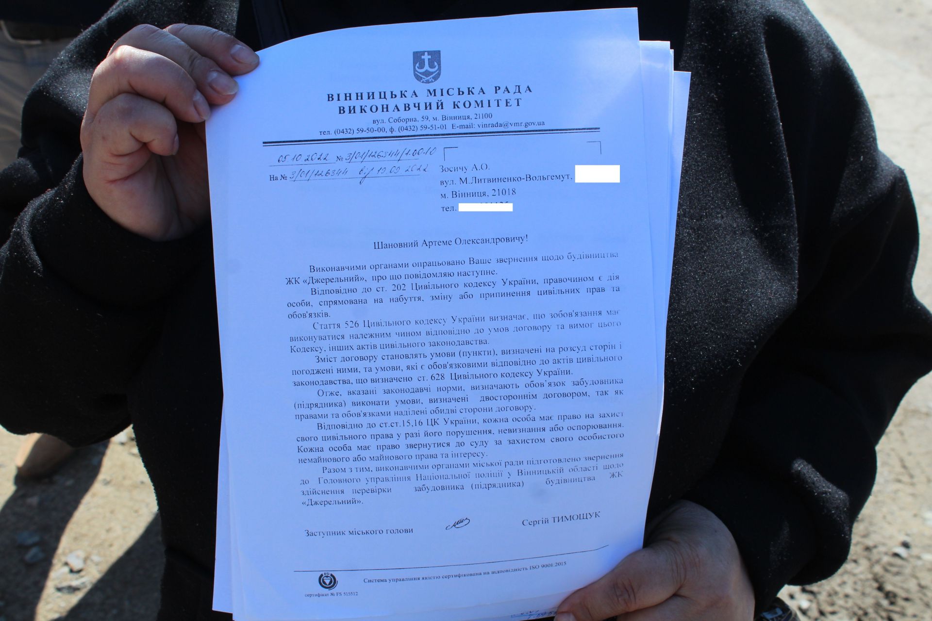 Переглянувши документи, дізналися, що дозволи на будівництво видавав департамент архітектурно-будівельного контролю Вінницької міськради. Хто підрядник? Хто замовник? У держсистемі цих даних немає. Також невідомі терміни здачі в експлуатацію зблокованих будинків на вулиці Джерельній.