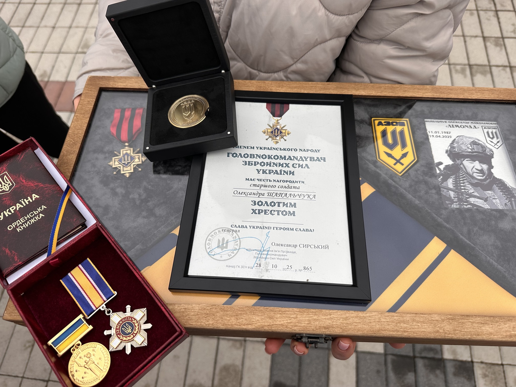 Олександр Шапальчук нагороджений орденом «За мужність» III ступеня (посмертно). Тепер побратими привезли ще одну відзнаку — нагрудний знак «Золотий Хрест» від Головнокомандувача ЗСУ. А ще — бойовий прапор «Азову», пам’ятну монету і портрет Олександра Шапальчука з позивним «Лимонад», викарбуваними на сталевій пластині.