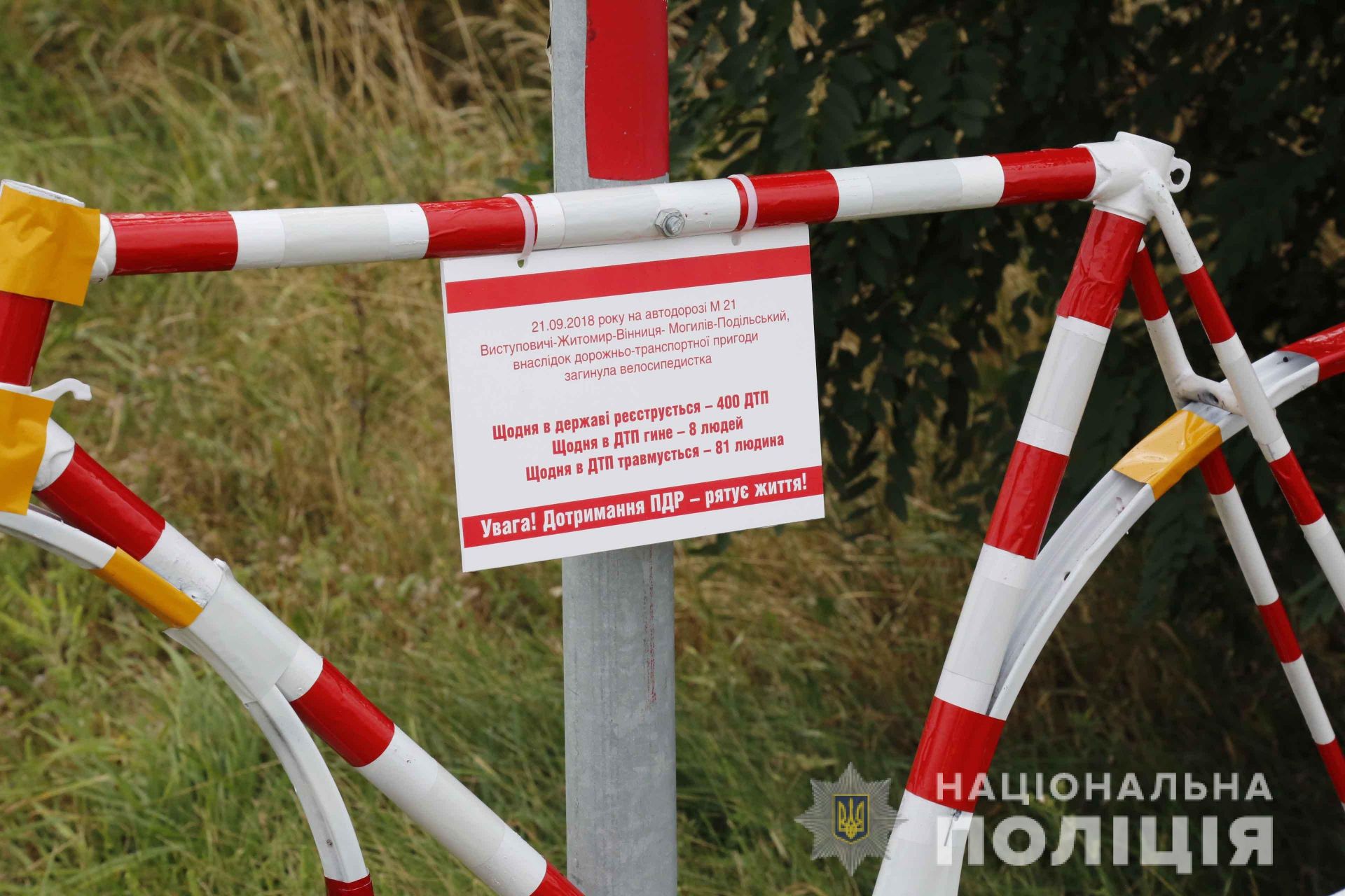 Перші два знаки загиблим велосипедистам встановили 27 серпня на Калинівській об'їзній та у селищі Вороновиця на узбіччі дороги міжнародного значення М -12.