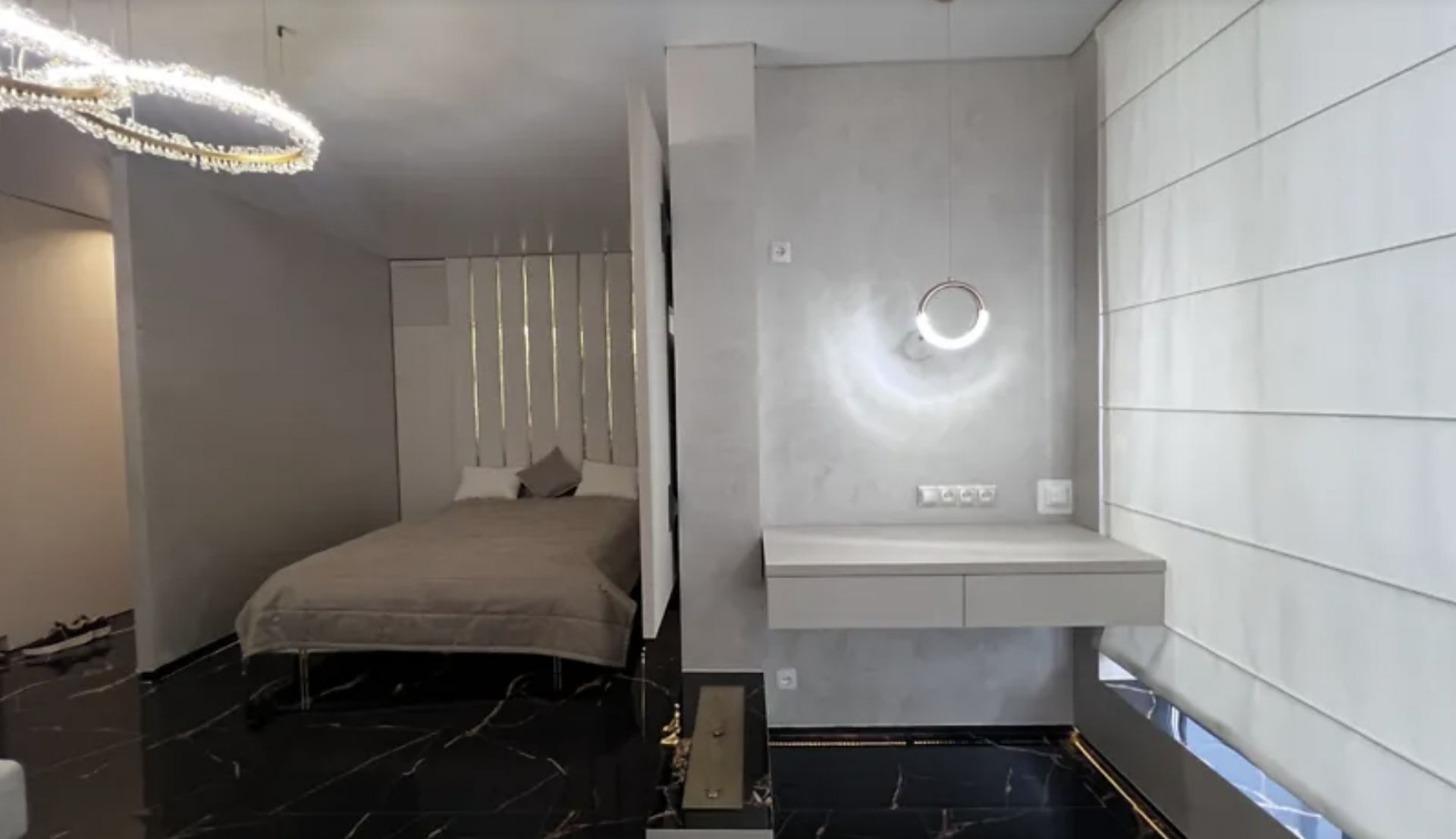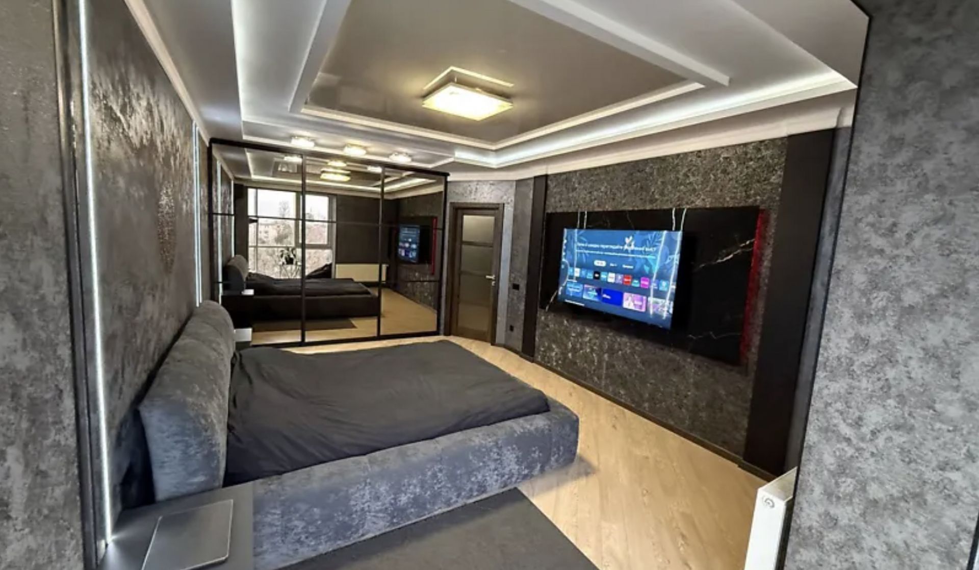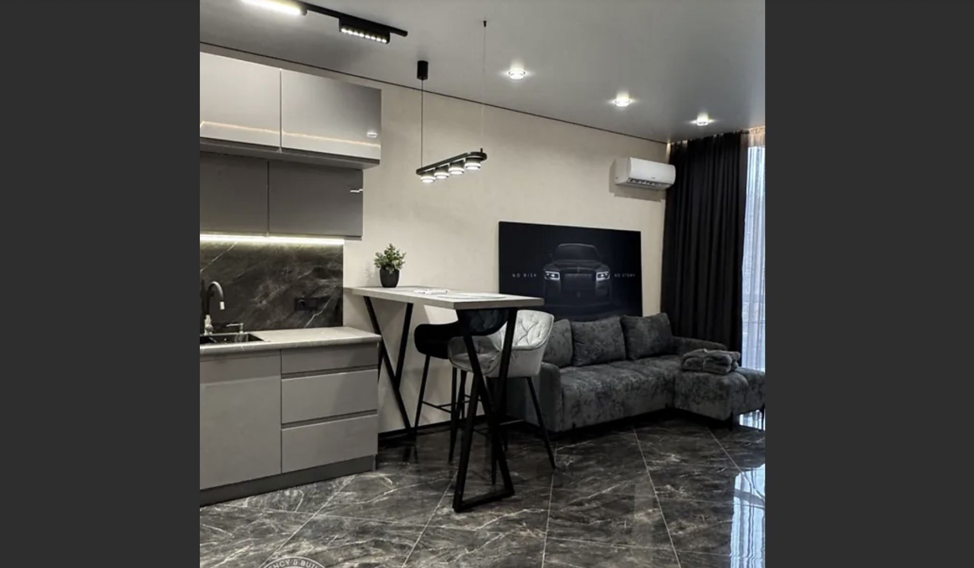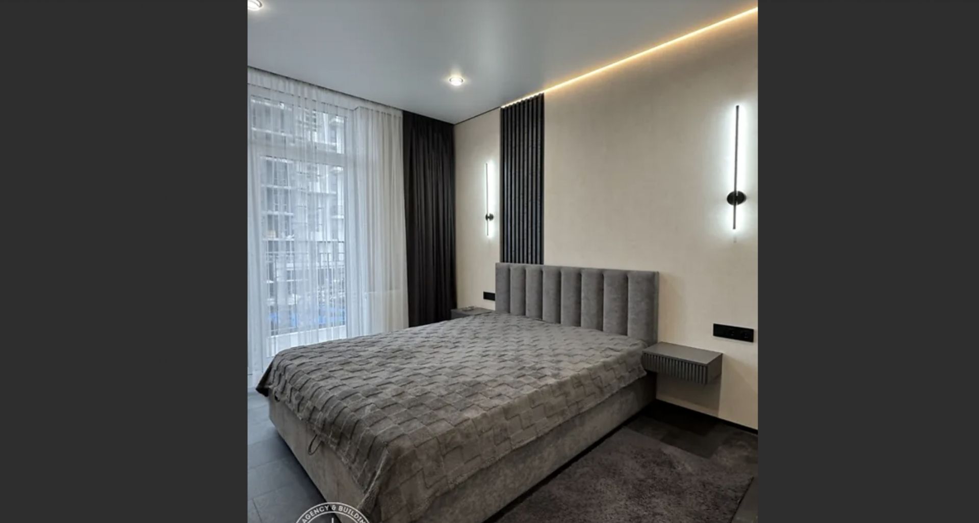 У оголошенні пишуть, що це перша здача помешкання, а в будинку, де знаходиться квартира, не вимикають світло. Тут є дизайнерський ремонт, повна комплектація меблів та техніки: двоспальне ліжко, диван, вмонтовані шафи, посудомийна машинка, вмонтований холодильник, телевізор, пральна машинка, витяжка, камін.
