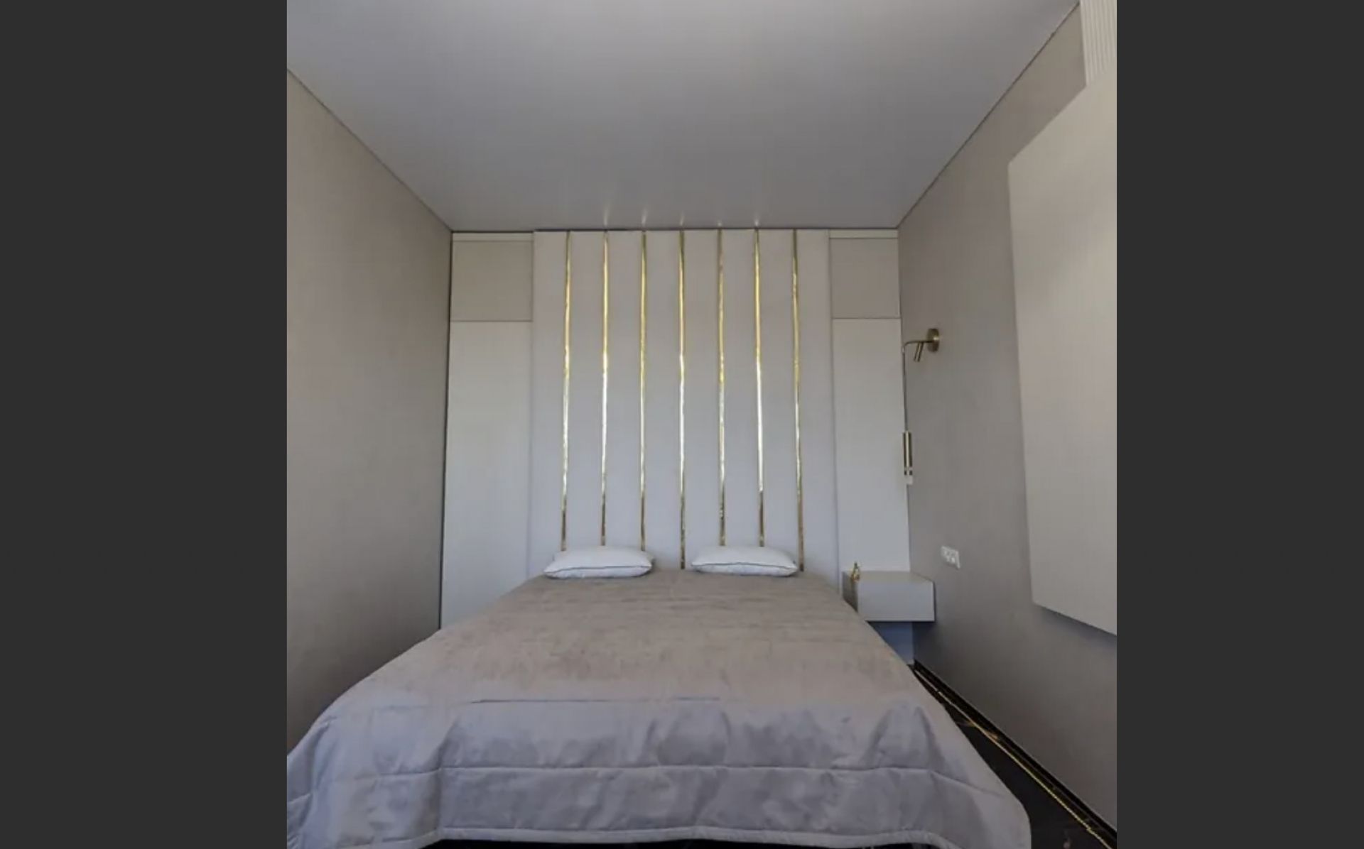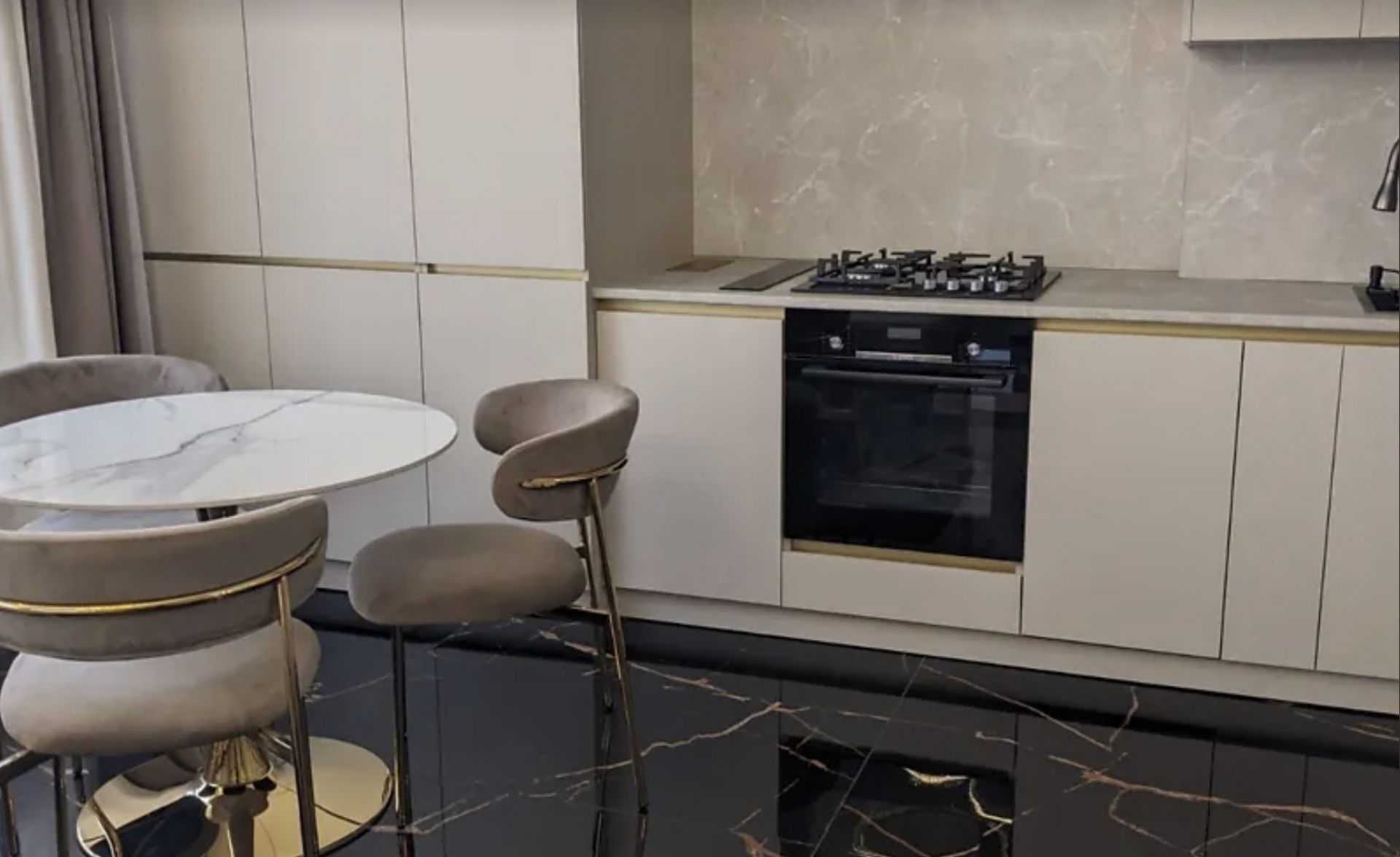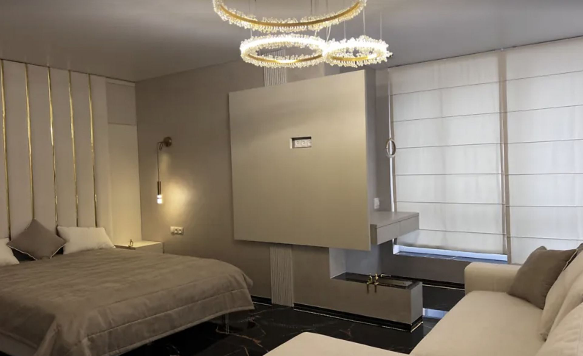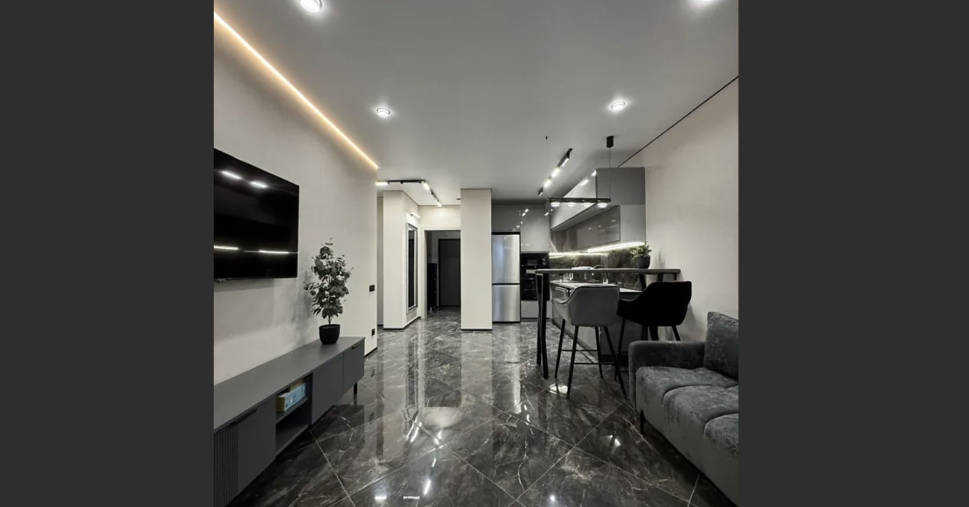 У оголошенні пишуть, що це перша здача помешкання, а в будинку, де знаходиться квартира, не вимикають світло. Тут є дизайнерський ремонт, повна комплектація меблів та техніки: двоспальне ліжко, диван, вмонтовані шафи, посудомийна машинка, вмонтований холодильник, телевізор, пральна машинка, витяжка, камін.