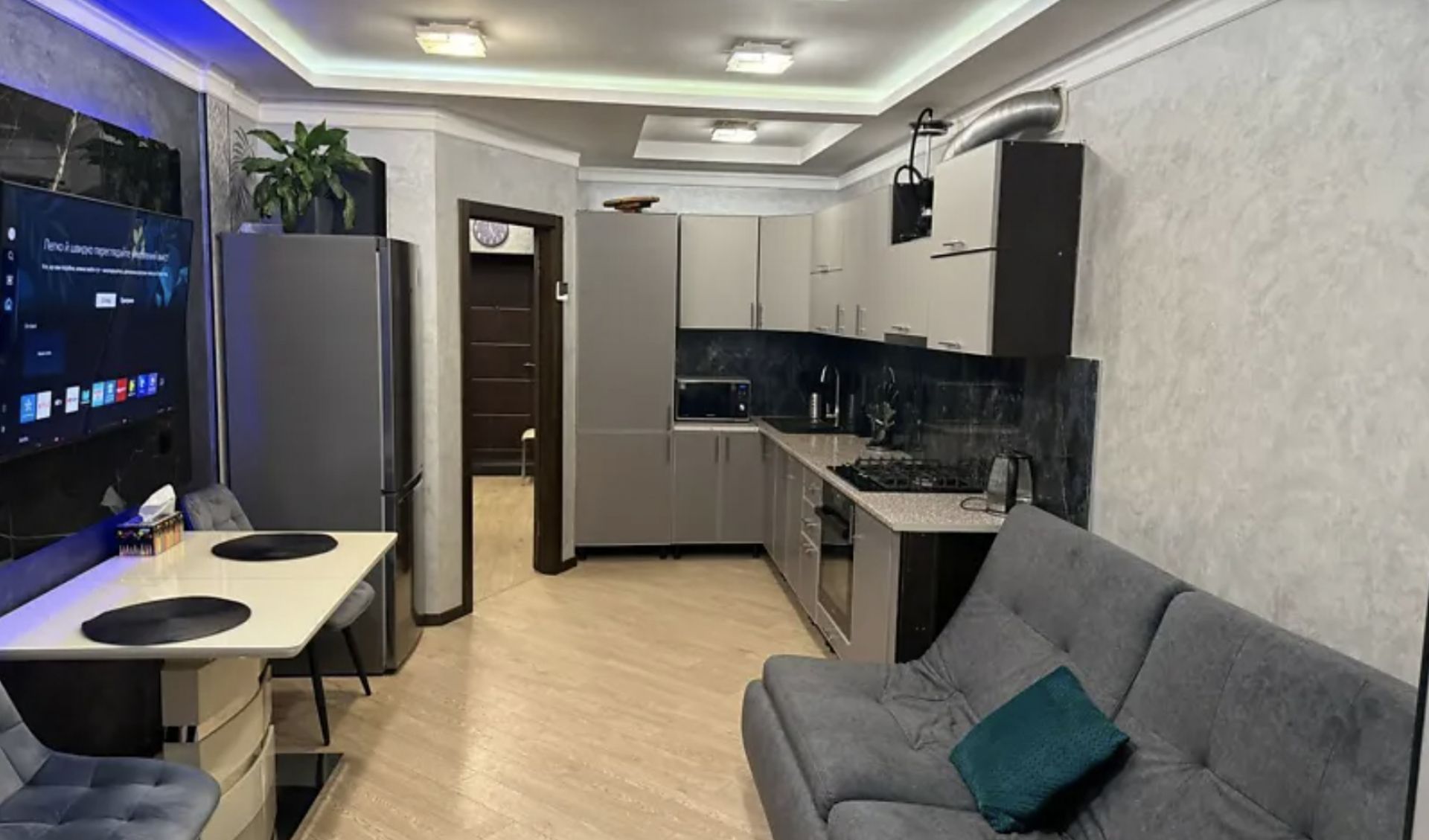 За даними оголошення, тут дизайнерський ремонт, висота стелі 2,7 метра, зовнішнє утеплення стін. Є всі необхідні меблі та техніка: домашній кінотеатр, душова кабіна, електроплита, духова шафа, вбудована кухня, витяжка, двоспальне ліжко.